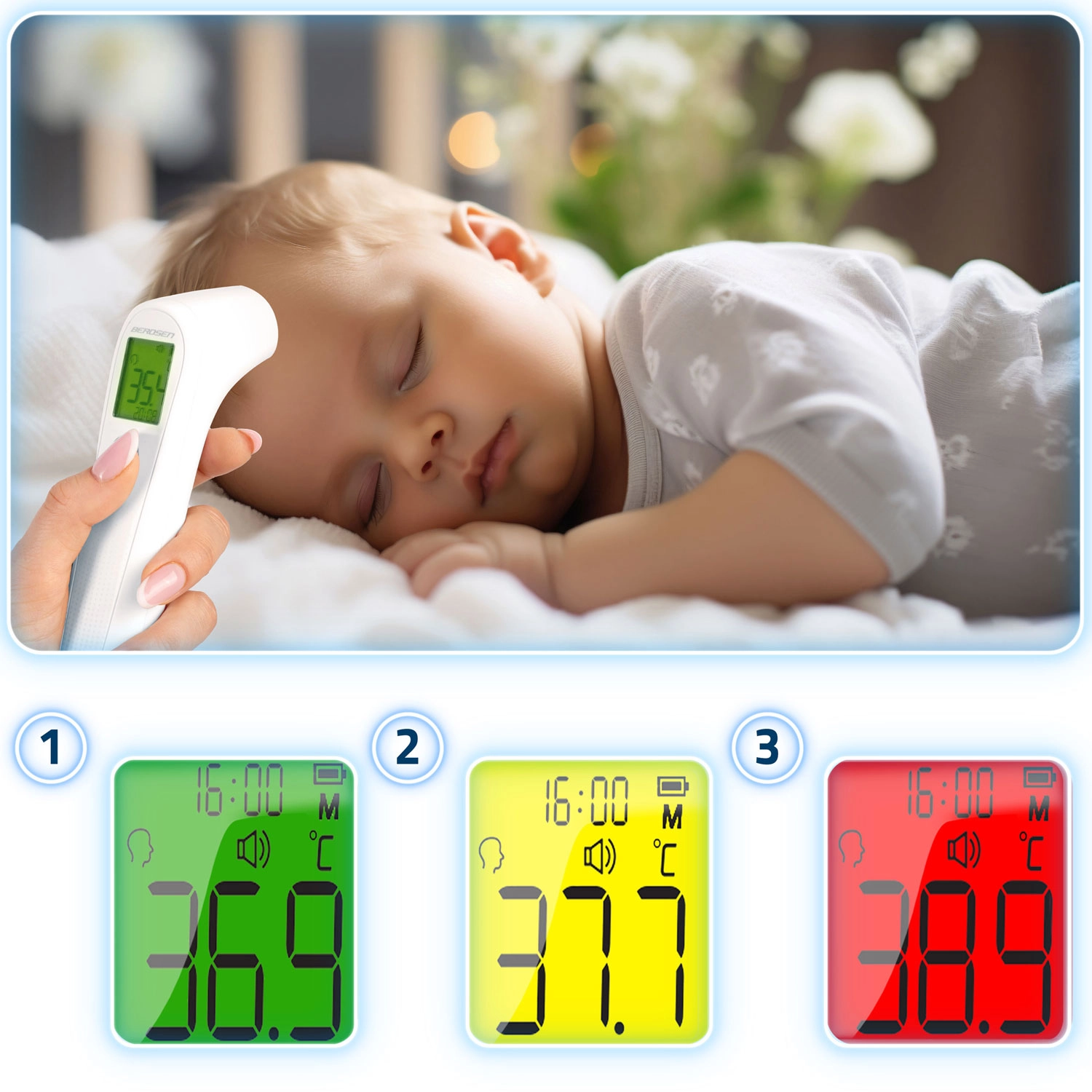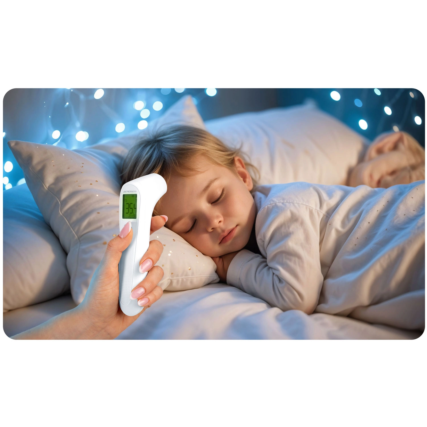 Meet comfortabel zelfs tijdens de slaap van je kind. Snelle en hygiënische temperatuurmeting zonder huidcontact, ideaal voor thuis en snelle screening.