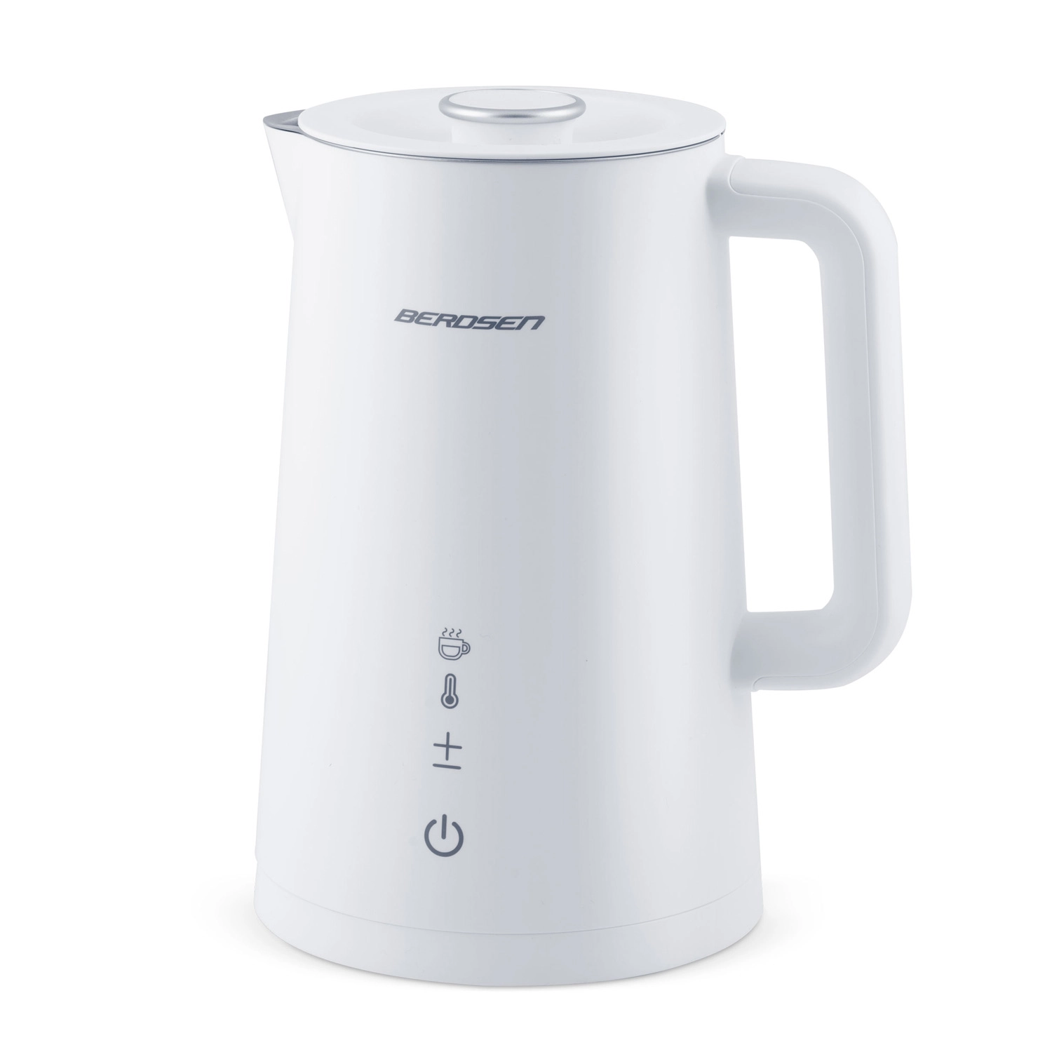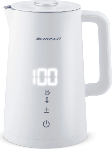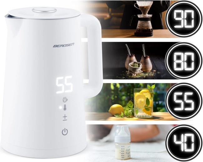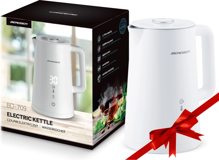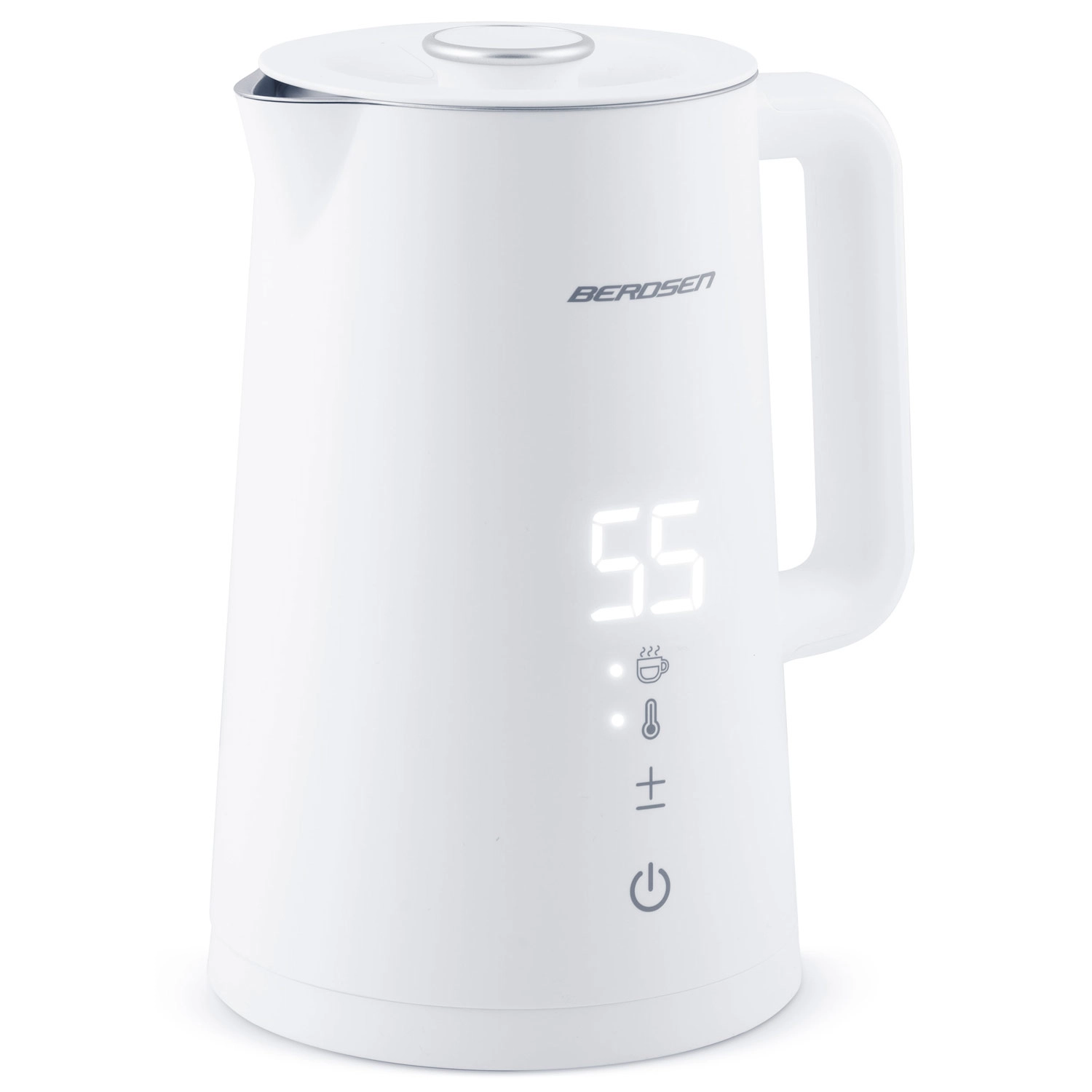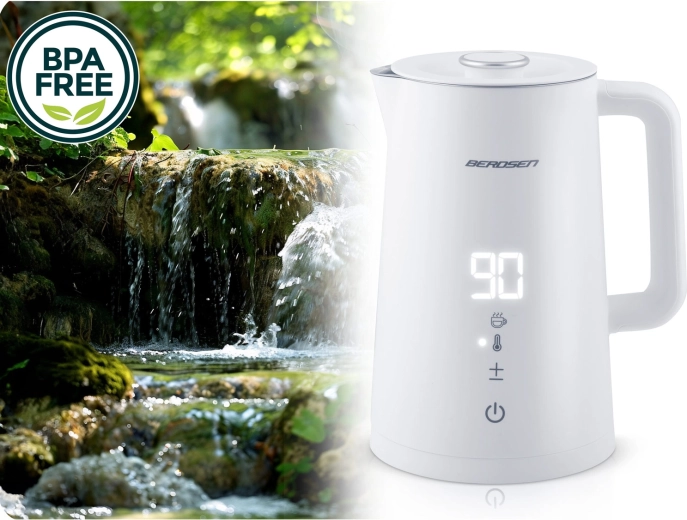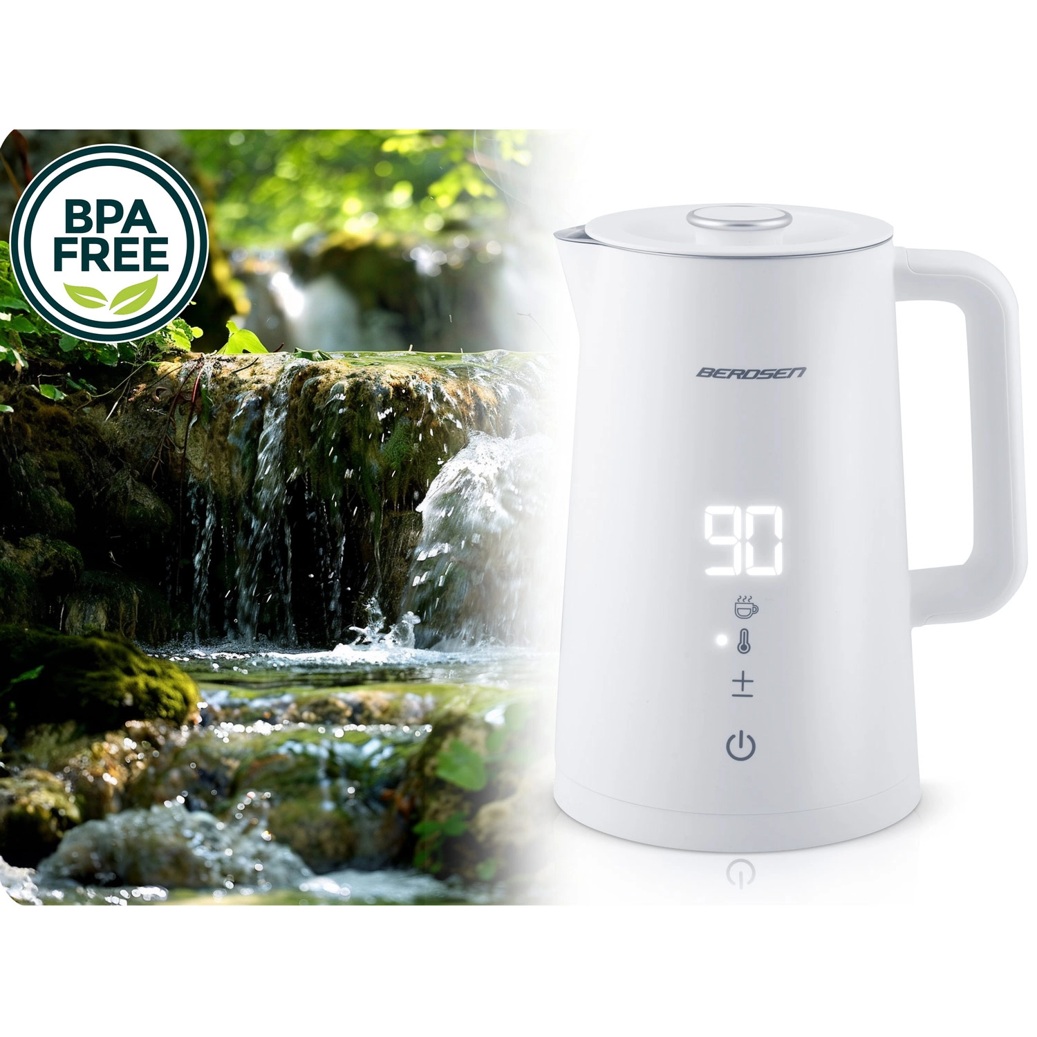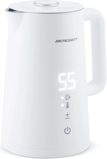 Stijlvolle elektrische waterkoker BERDSEN met een inhoud van 1,7 l biedt nauwkeurige temperatuurinstelling in 5 niveaus, touchpanel met LED-display, warmhoudfunctie tot 2 uur en een veilige dubbelwandige CoolTouch-constructie. De binnenkant van roestvrij staal SUS 304 zorgt voor een zuivere smaak van het water en een lange levensduur.