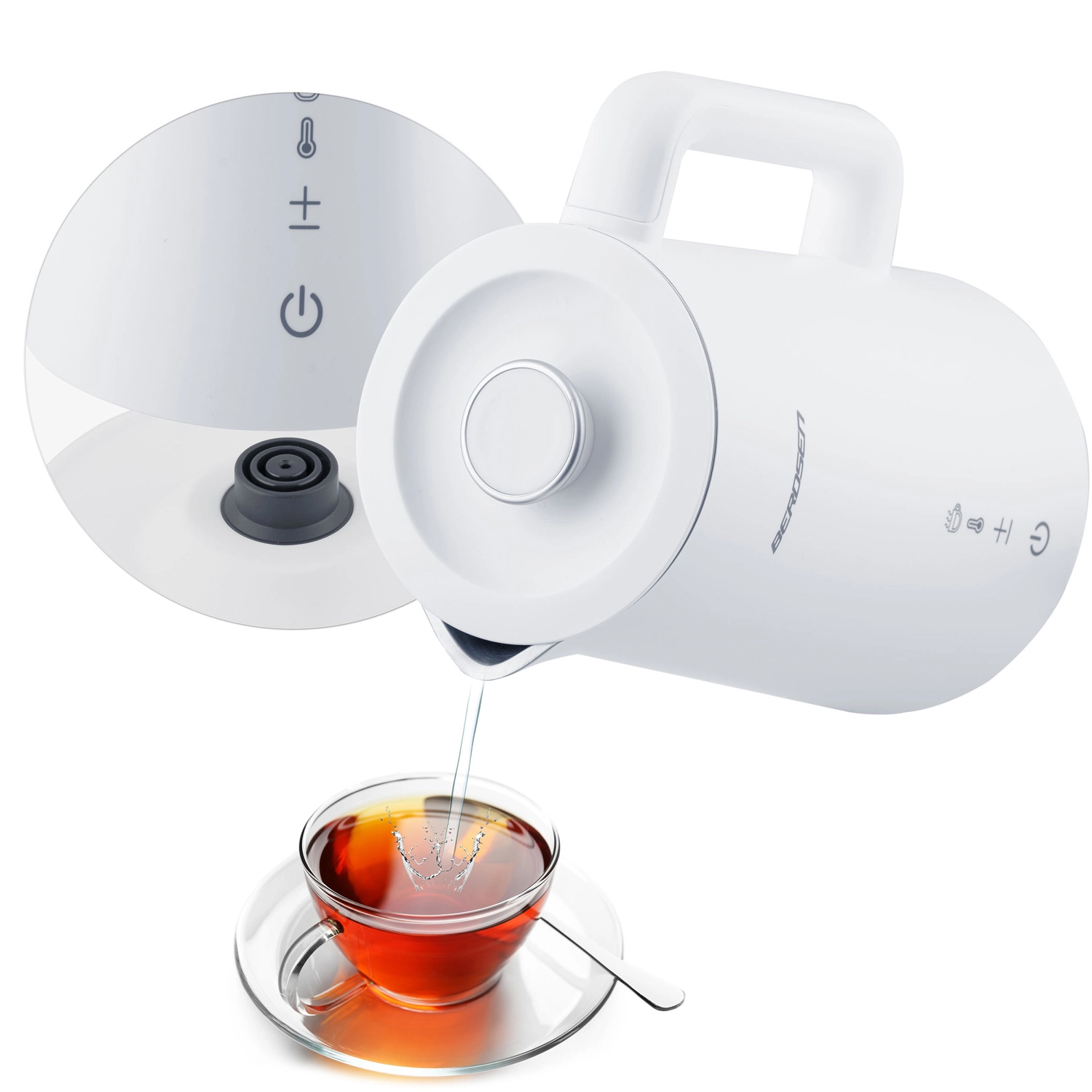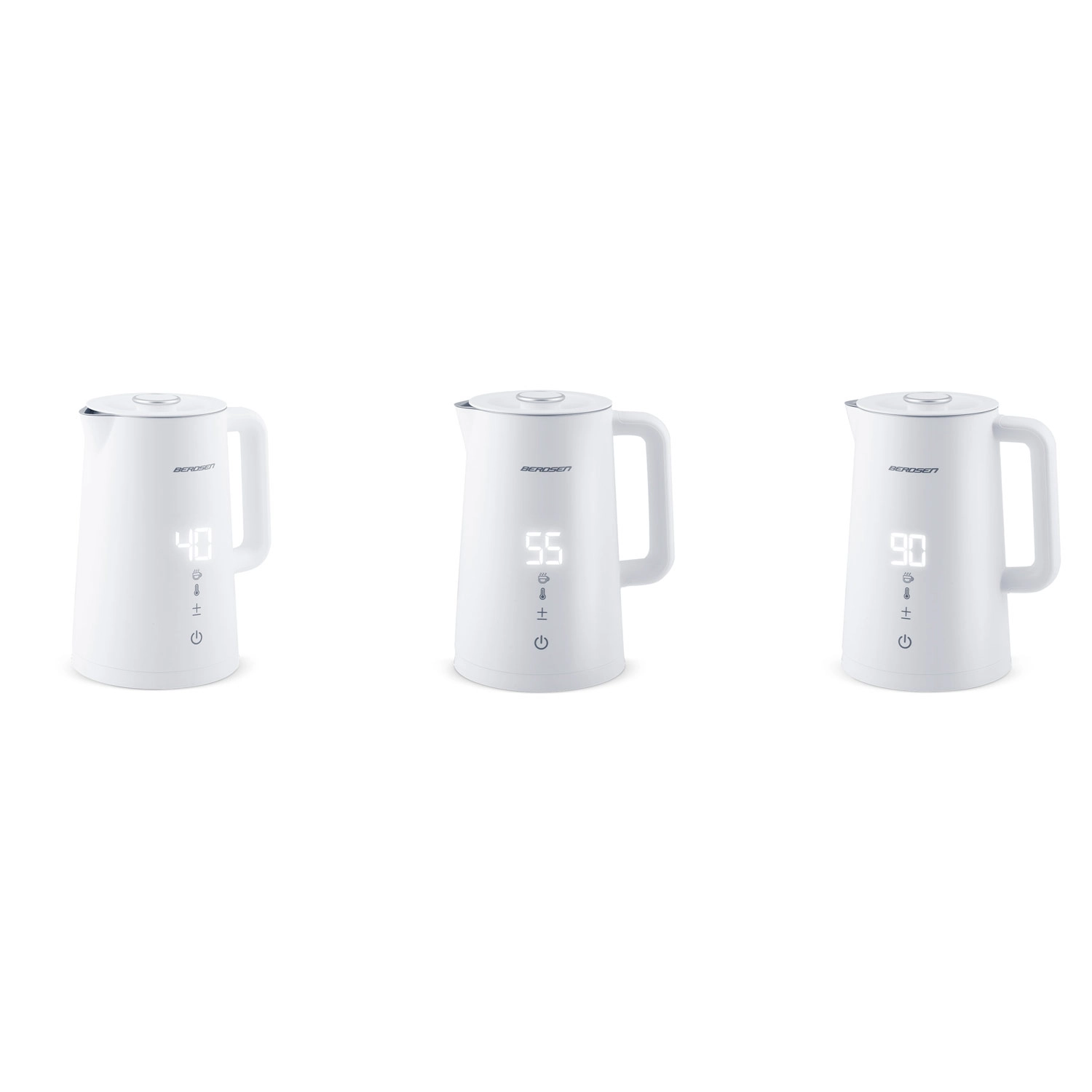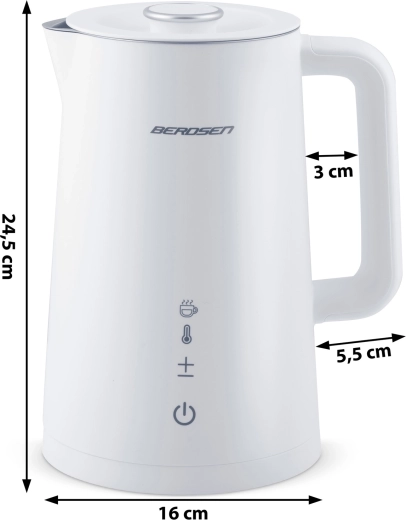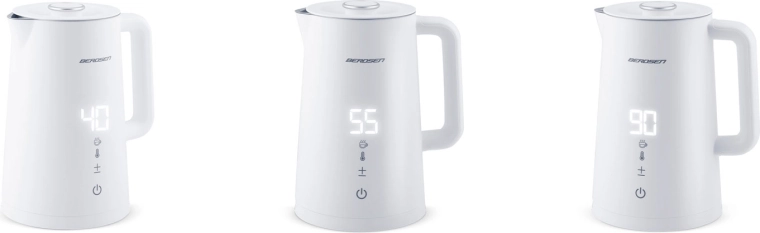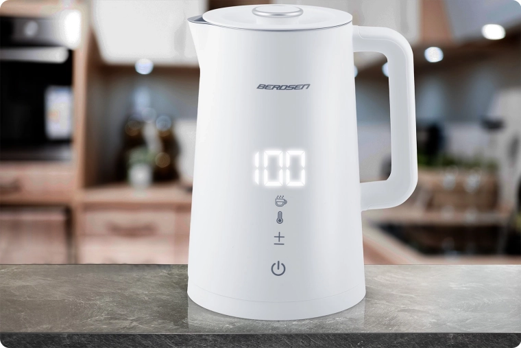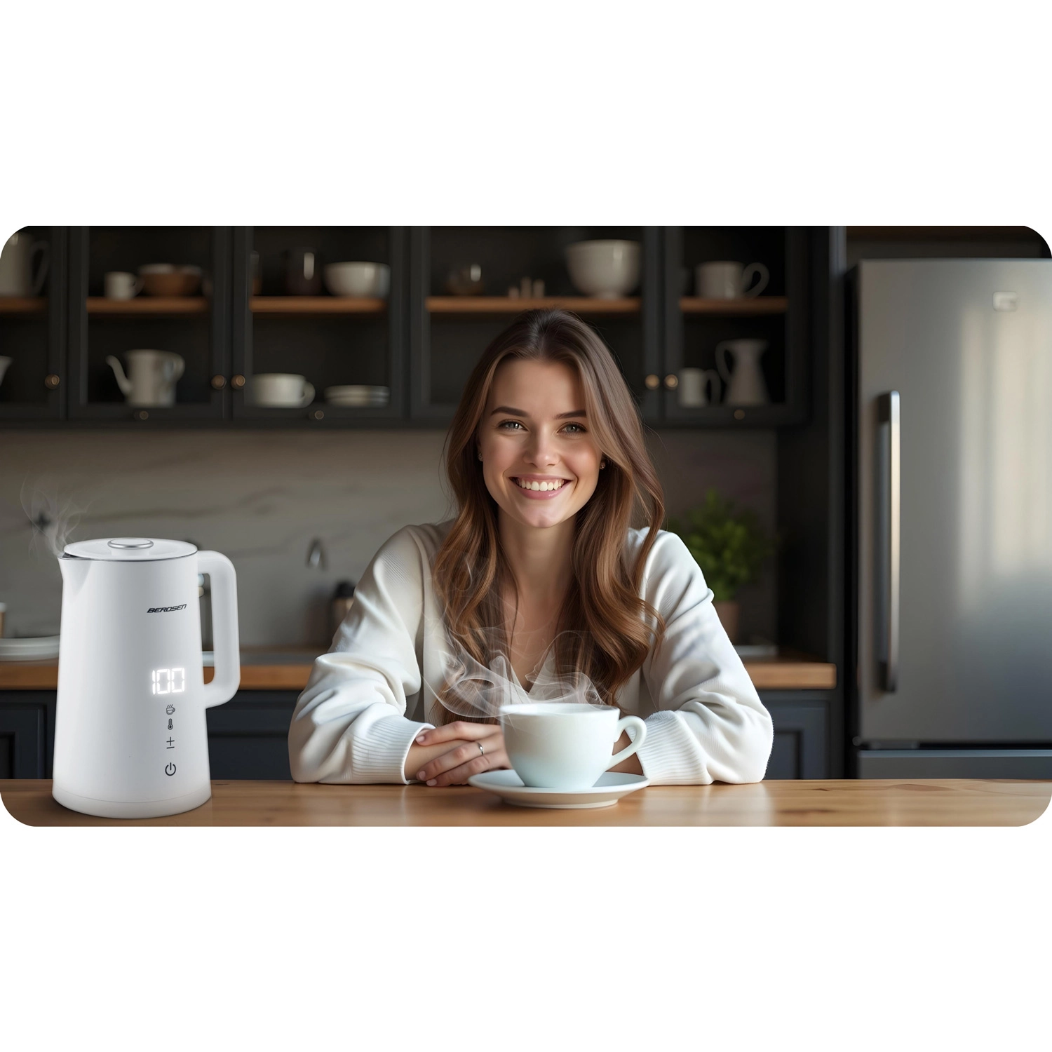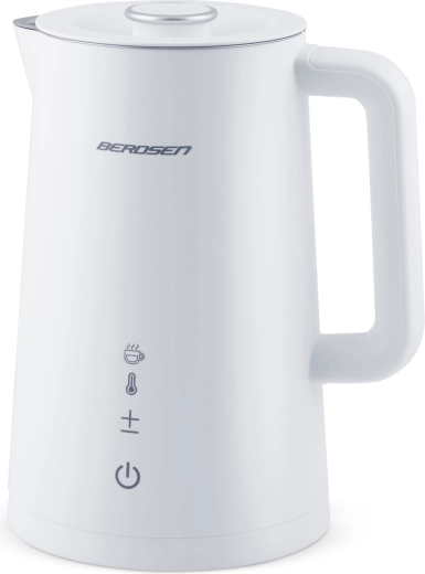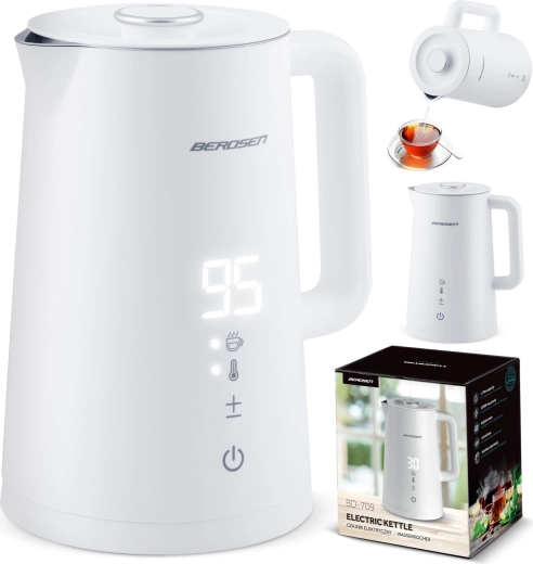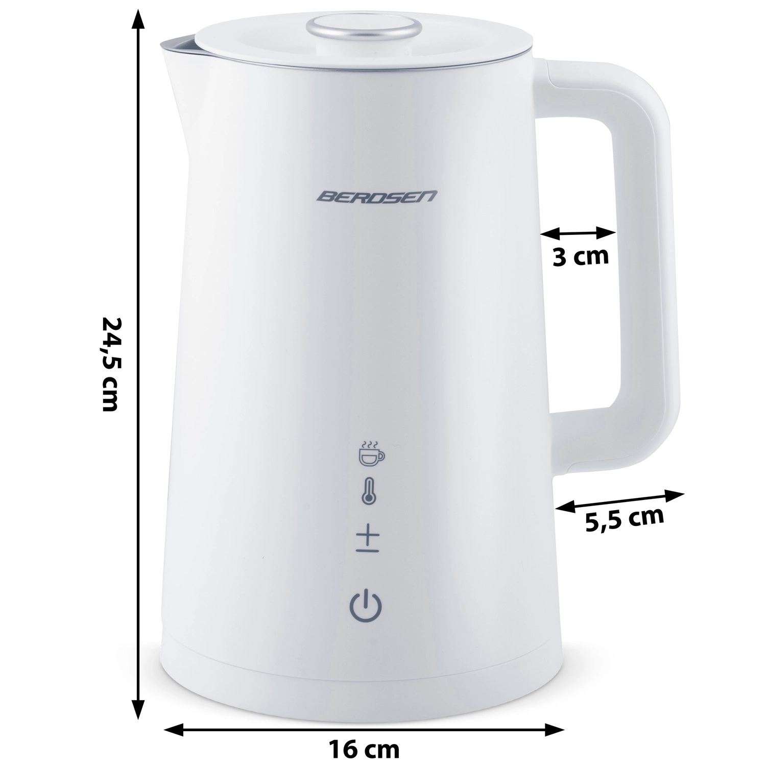 Stijlvolle elektrische waterkoker BERDSEN met een inhoud van 1,7 l biedt nauwkeurige temperatuurinstelling in 5 niveaus, touchpanel met LED-display, warmhoudfunctie tot 2 uur en een veilige dubbelwandige CoolTouch-constructie. De binnenkant van roestvrij staal SUS 304 zorgt voor een zuivere smaak van het water en een lange levensduur.