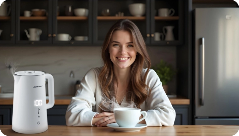 De binnenkan van roestvrij staal SUS 304 (BPA-vrij) garandeert veilig contact met water, een zuivere smaak en hoge duurzaamheid. De waterkoker is uitgerust met een 360° draaivoet met antislipvoetjes en een praktische kabelopbergruimte, waardoor hij in elke keuken past.