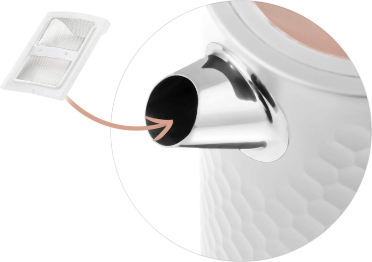 Het uitneembare metalen filter in de schenktuit houdt kalkaanslag tegen. Eenvoudig te reinigen of te vervangen.