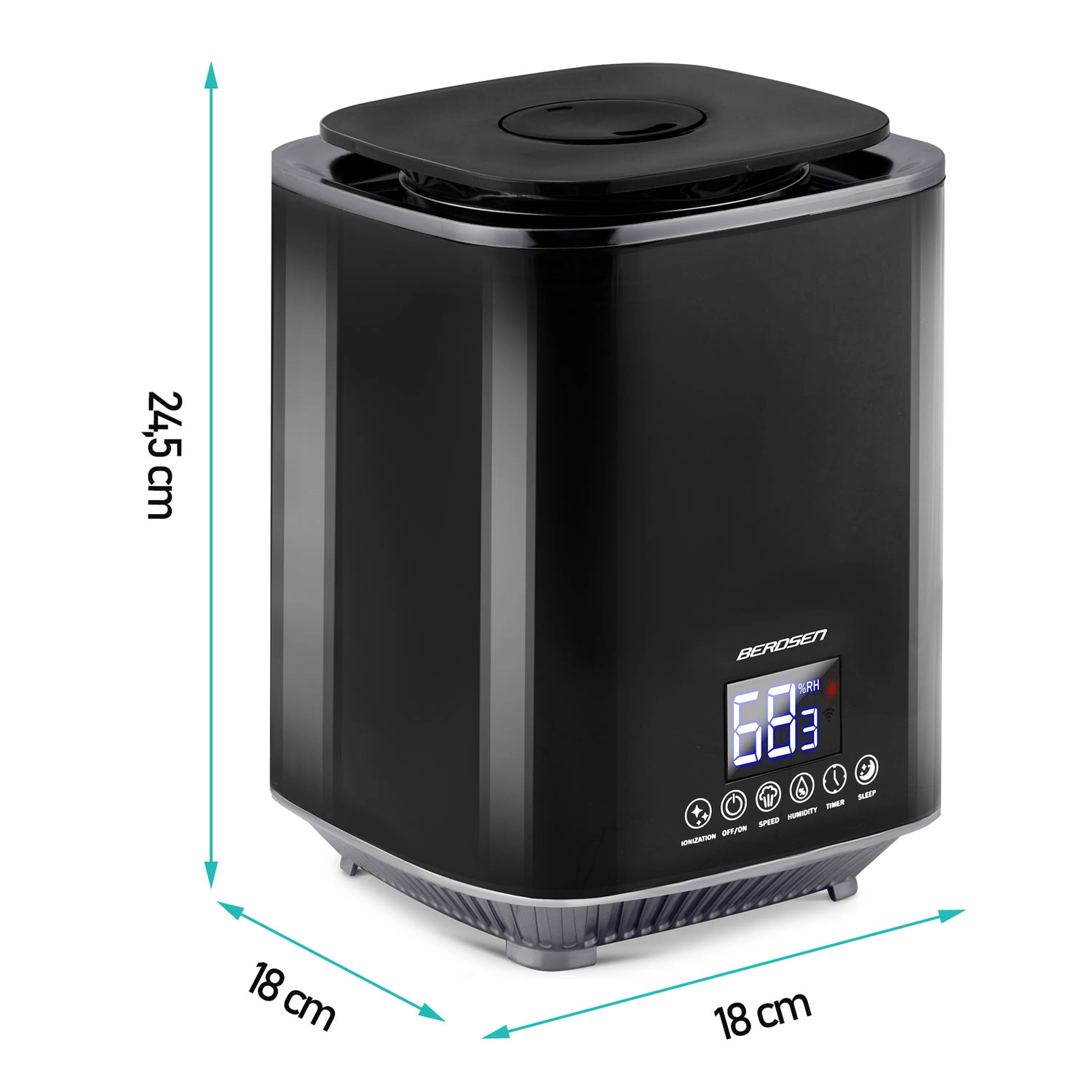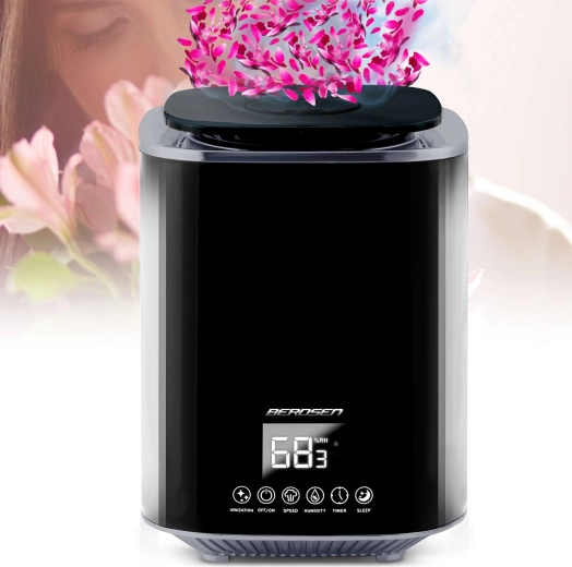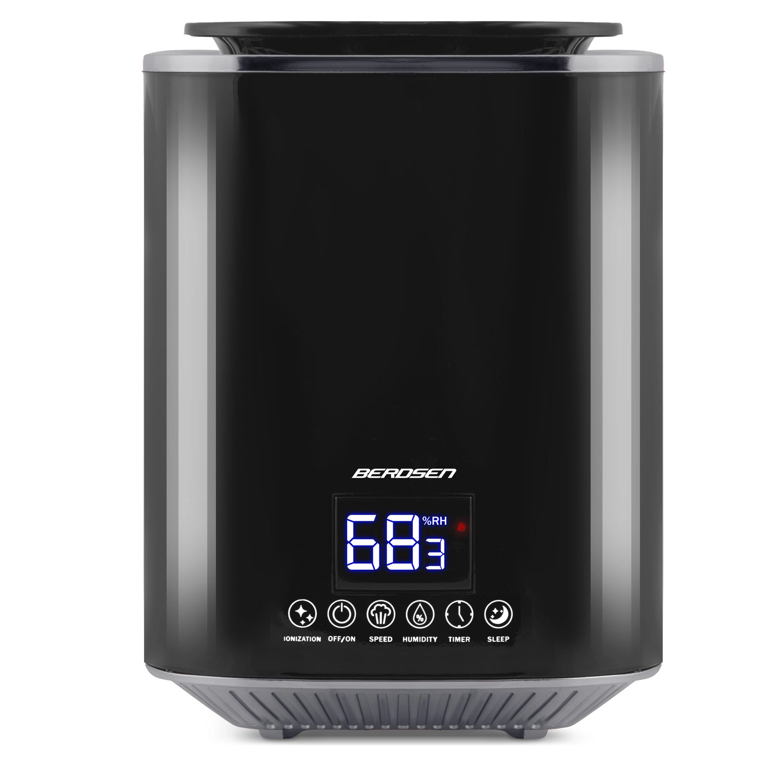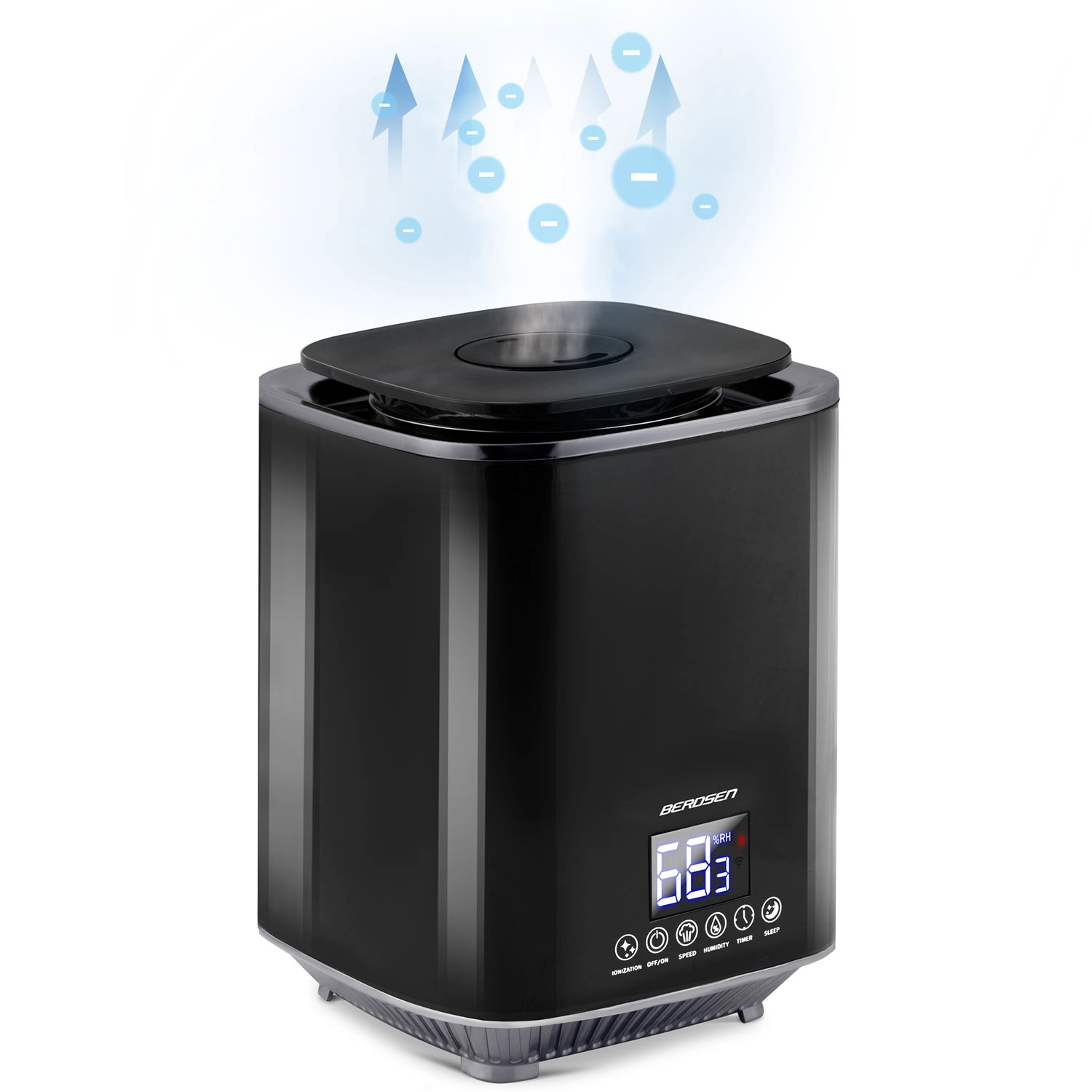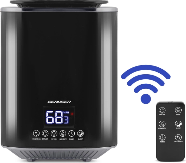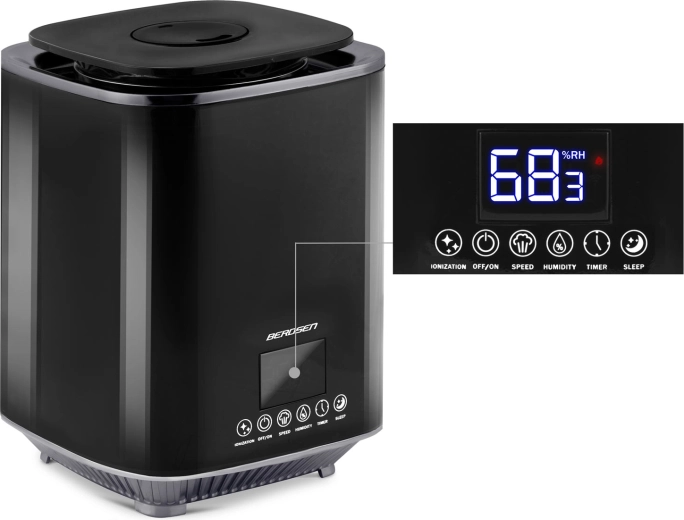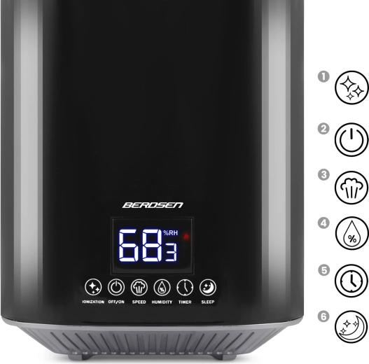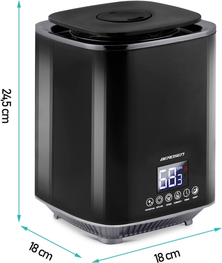 Moderne ultrasone luchtbevochtiger BERDSEN met ionisatie en aromatherapie zorgt voor een gezond klimaat thuis en op kantoor. Biedt een capaciteit tot 250 ml/u, een grote watertank van 2,6 l, nauwkeurige vochtigheidsregeling via een hygrostaat 45–90% en een ingebouwde hygrometer. Comfortabele bediening via een aanraakgevoelig LED‑paneel en afstandsbediening, plus timer, nachtmodus en automatische uitschakeling wanneer de tank leeg is.