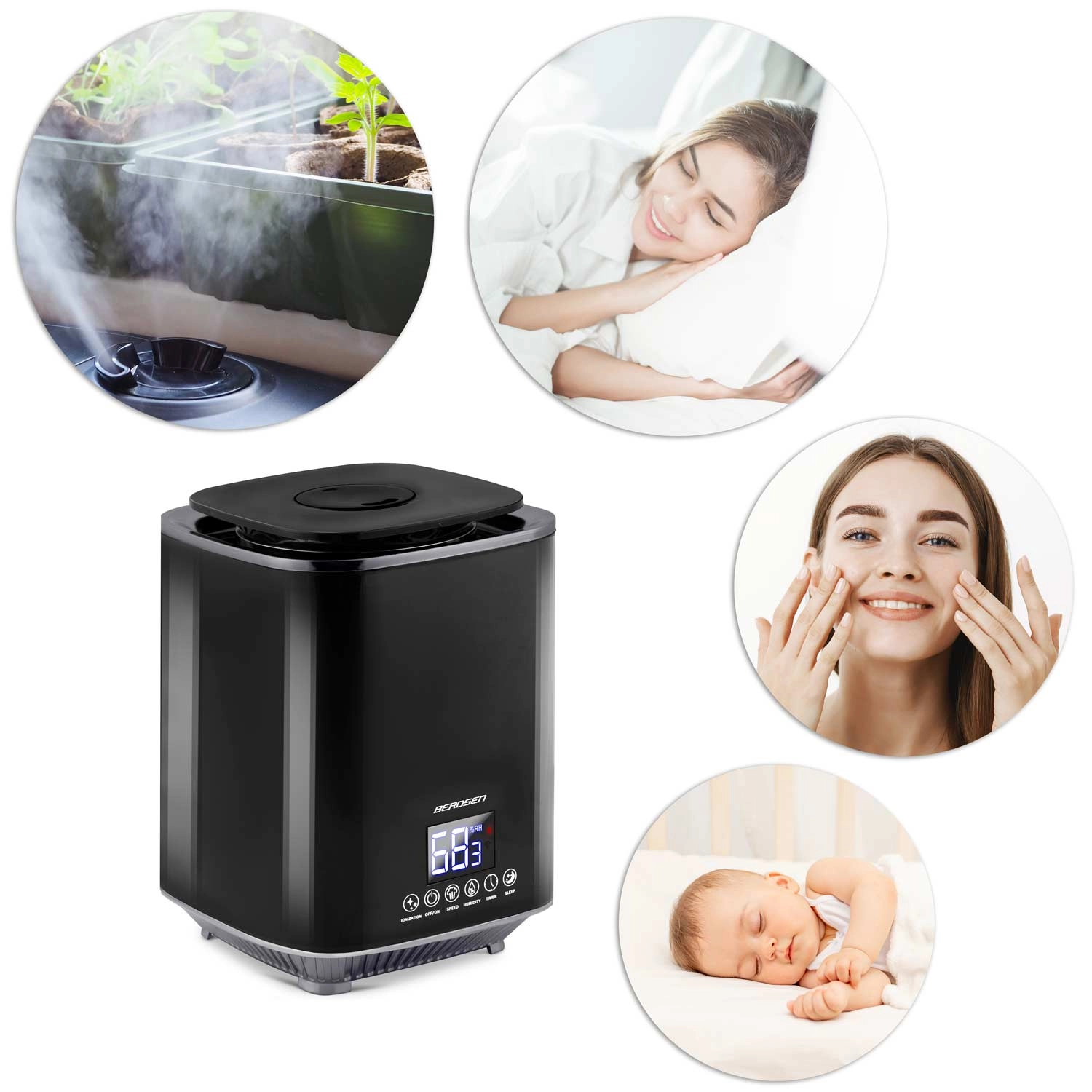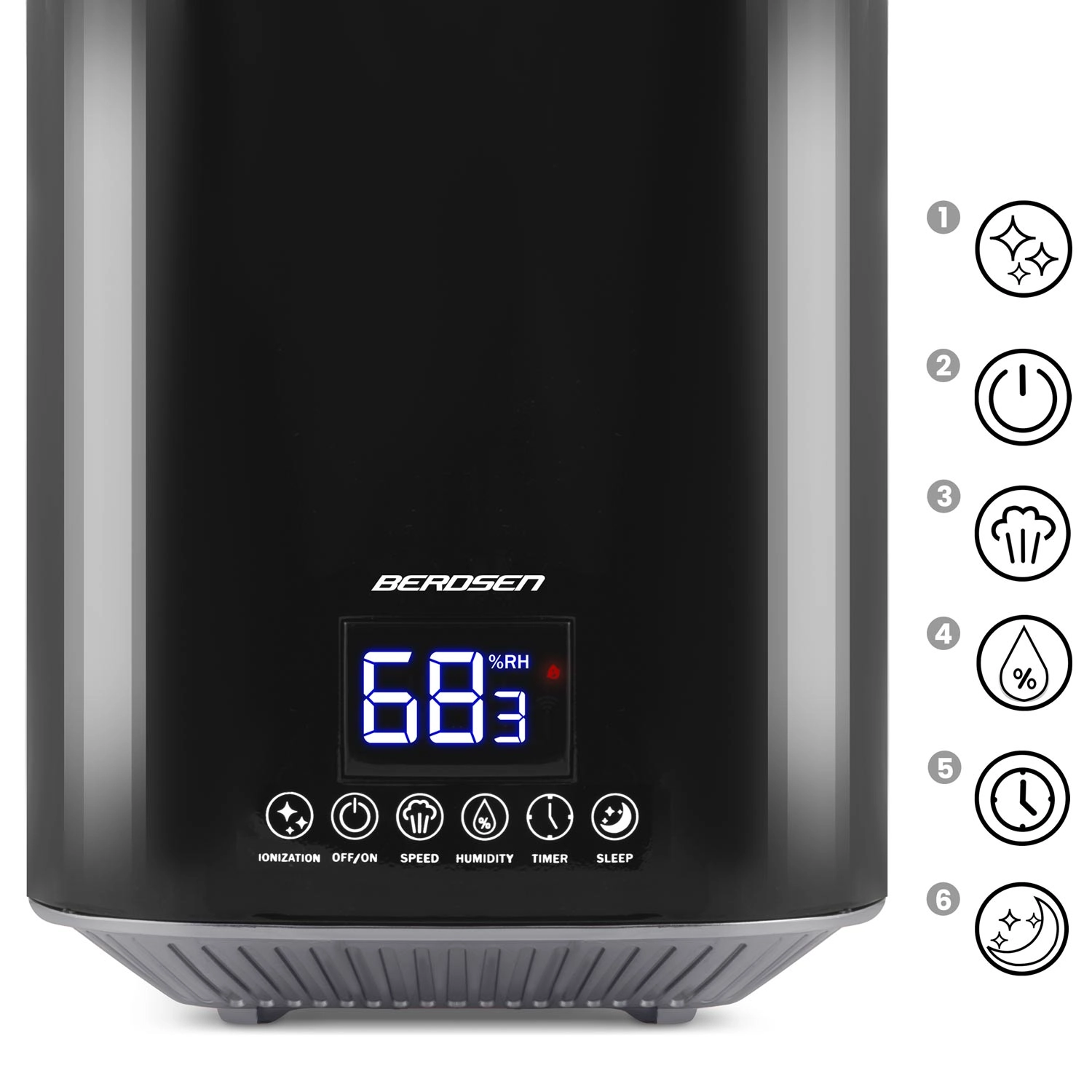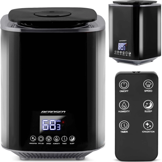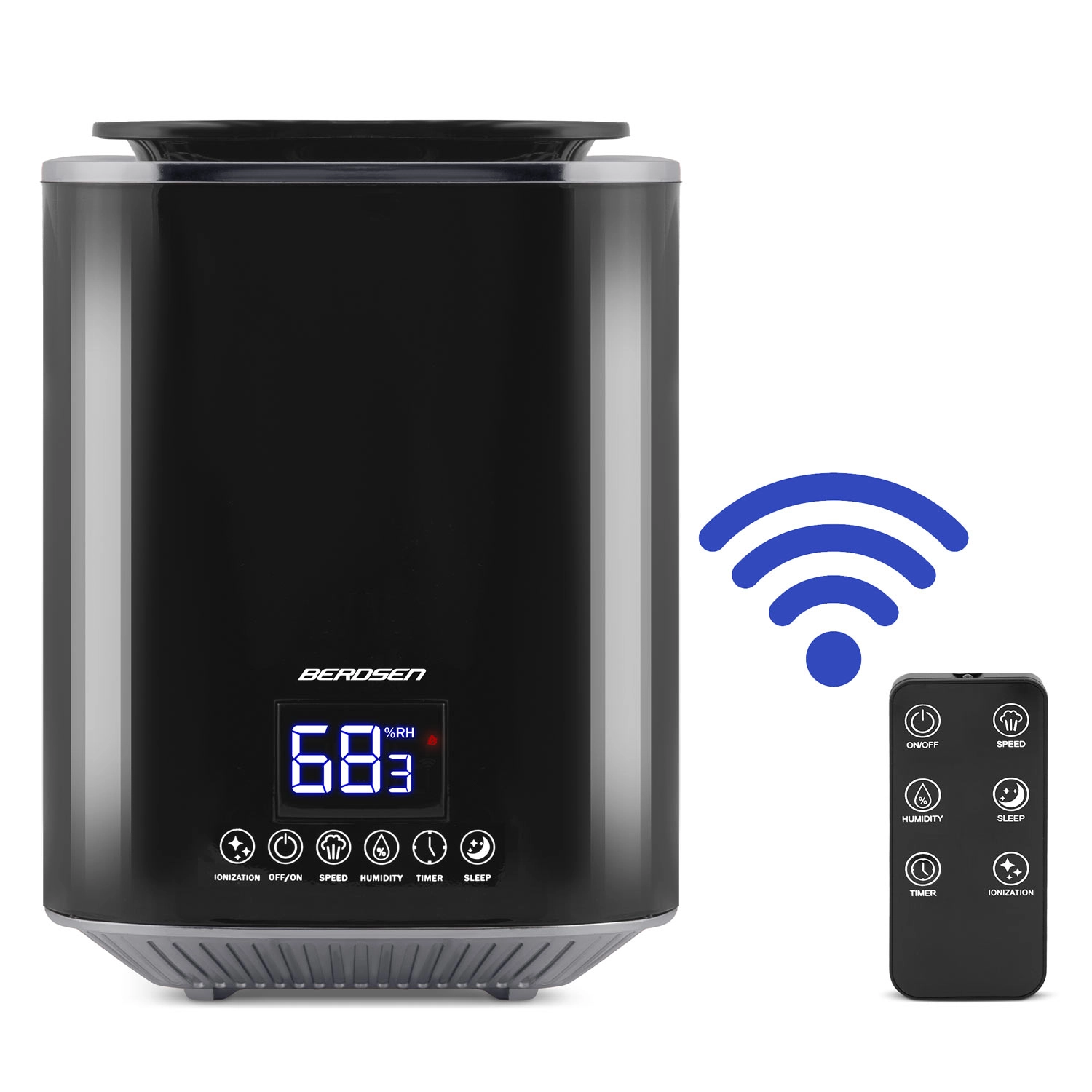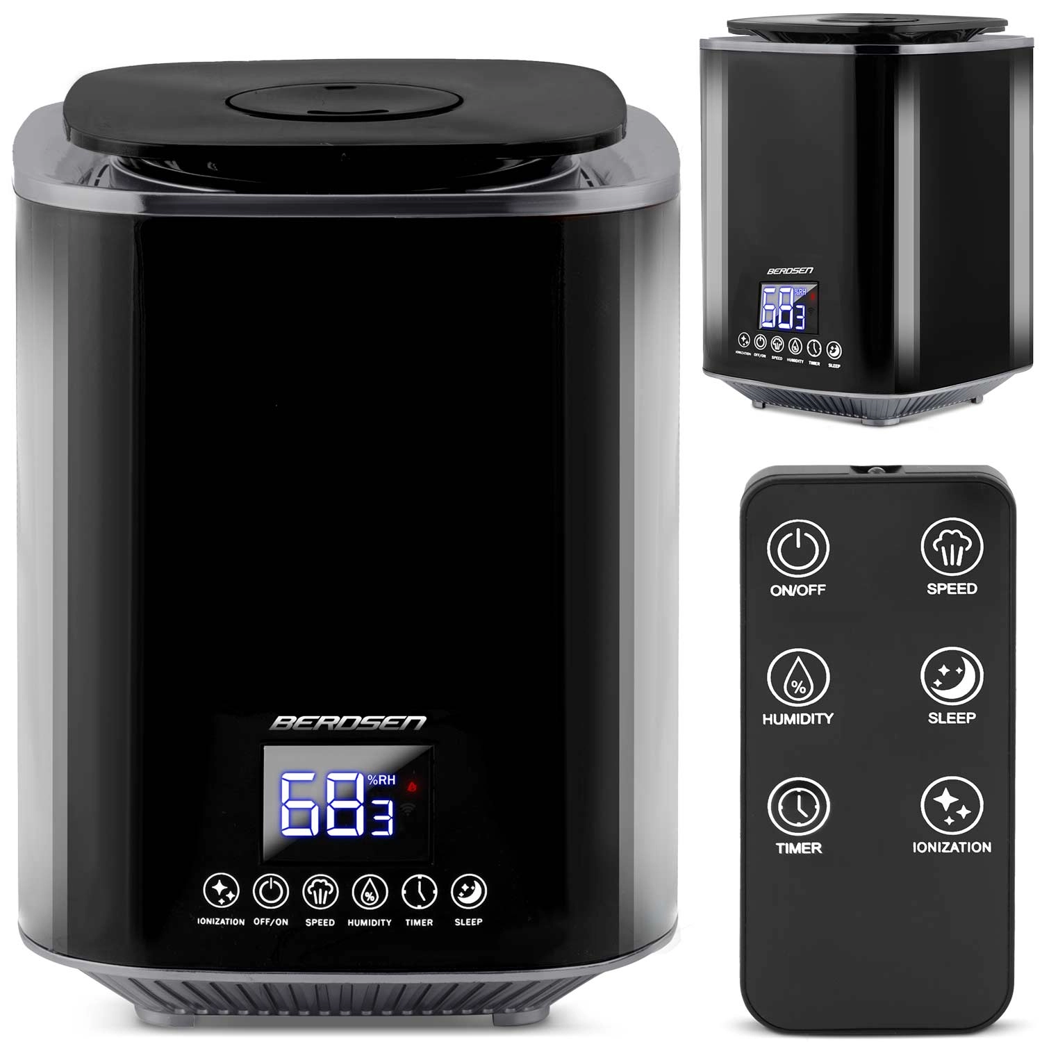 Moderne ultrasone luchtbevochtiger BERDSEN met ionisatie en aromatherapie zorgt voor een gezond klimaat thuis en op kantoor. Biedt een capaciteit tot 250 ml/u, een grote watertank van 2,6 l, nauwkeurige vochtigheidsregeling via een hygrostaat 45–90% en een ingebouwde hygrometer. Comfortabele bediening via een aanraakgevoelig LED‑paneel en afstandsbediening, plus timer, nachtmodus en automatische uitschakeling wanneer de tank leeg is.
