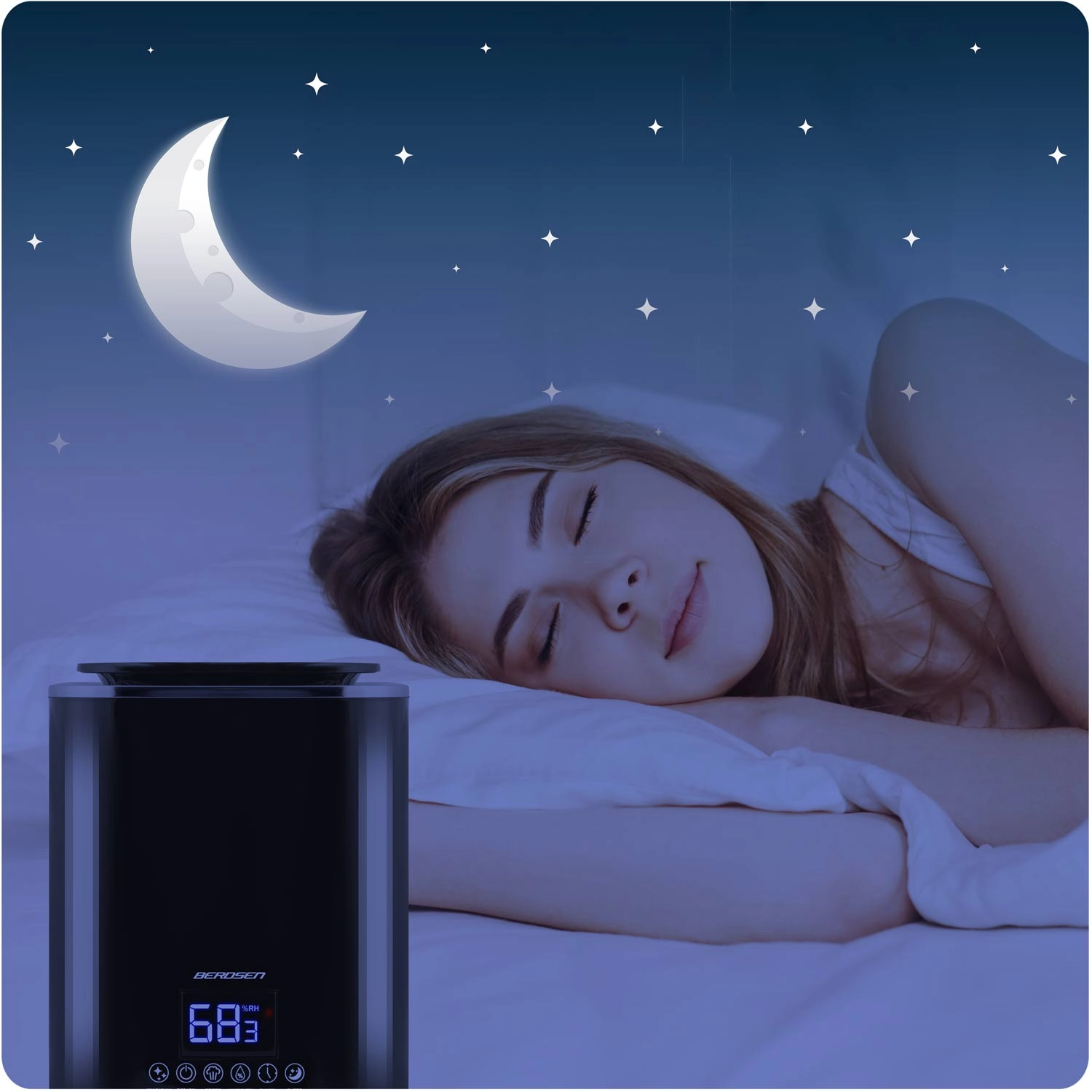 De slimme hygrostaat (45–90%) houdt de ingestelde vochtigheid aan en schakelt het apparaat na het bereiken daarvan naar standby. De nachtmodus dimt het display en het apparaat werkt stil verder. Intuïtieve aanraakbediening wordt aangevuld met een timer 1–9 u en een handige automatische uitschakeling bij een tekort aan water.
