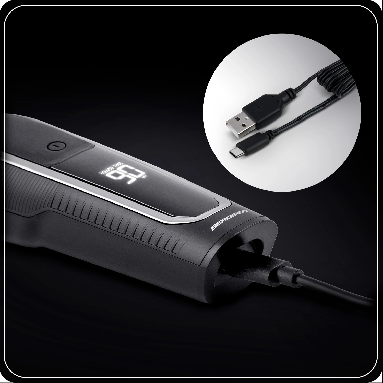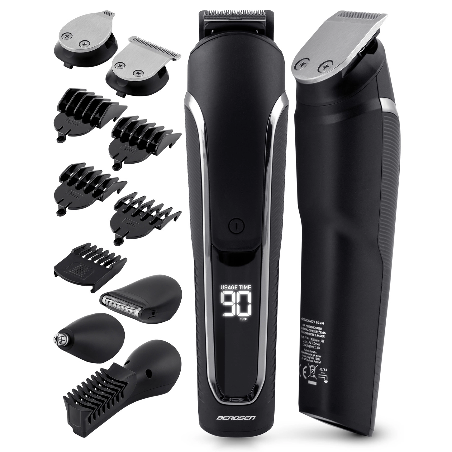 Universele 6-in-1 BERDSEN trimmer- en scheerset voor haar, baard en lichaam met LCD-display, scherpe stalen messen en batterij tot 90 minuten. Opladen via USB‑C, 5 verwisselbare opzetstukken en 5 kamopzetstukken (1–12 mm) voor nauwkeurig stylen, contouren en glad scheren. Ergonomisch, draadloos en klaar voor dagelijkse styling.