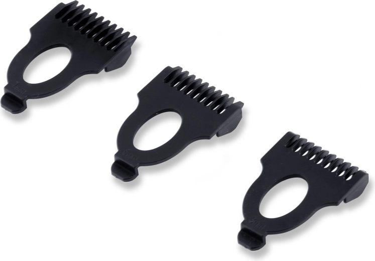 - 3 kamopzetstukken (3–7 mm) voor exacte instelling van baard- en haarlengte.