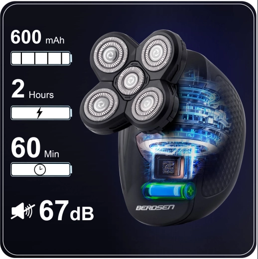 - Kop met roterende messen – volgt soepel de gezichtscontouren voor een glad scheerresultaat.