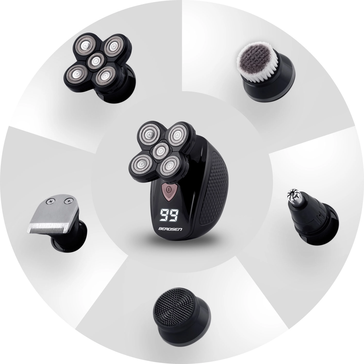 - 5 stuks: roterende kop, precisiekop/trimmer, neus-/oortrimmer, kop met spons, kop met borstel