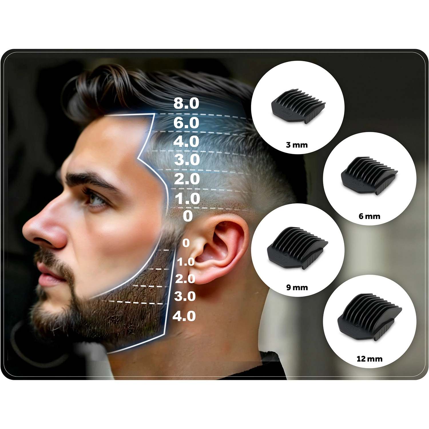 Vier opzetkammen maken vloeiende overgangen, verschillende kniplengtes en veelzijdig gebruik voor zowel haar als baard mogelijk.