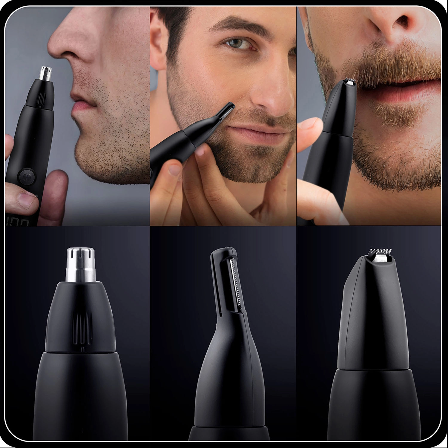 - 3 verwisselbare koppen: roterende kop voor neus en oren, brede kop voor snel scheren van grotere oppervlakken (wangen, hals) en een precieze kop voor details, contouren van bakkebaarden en snor.