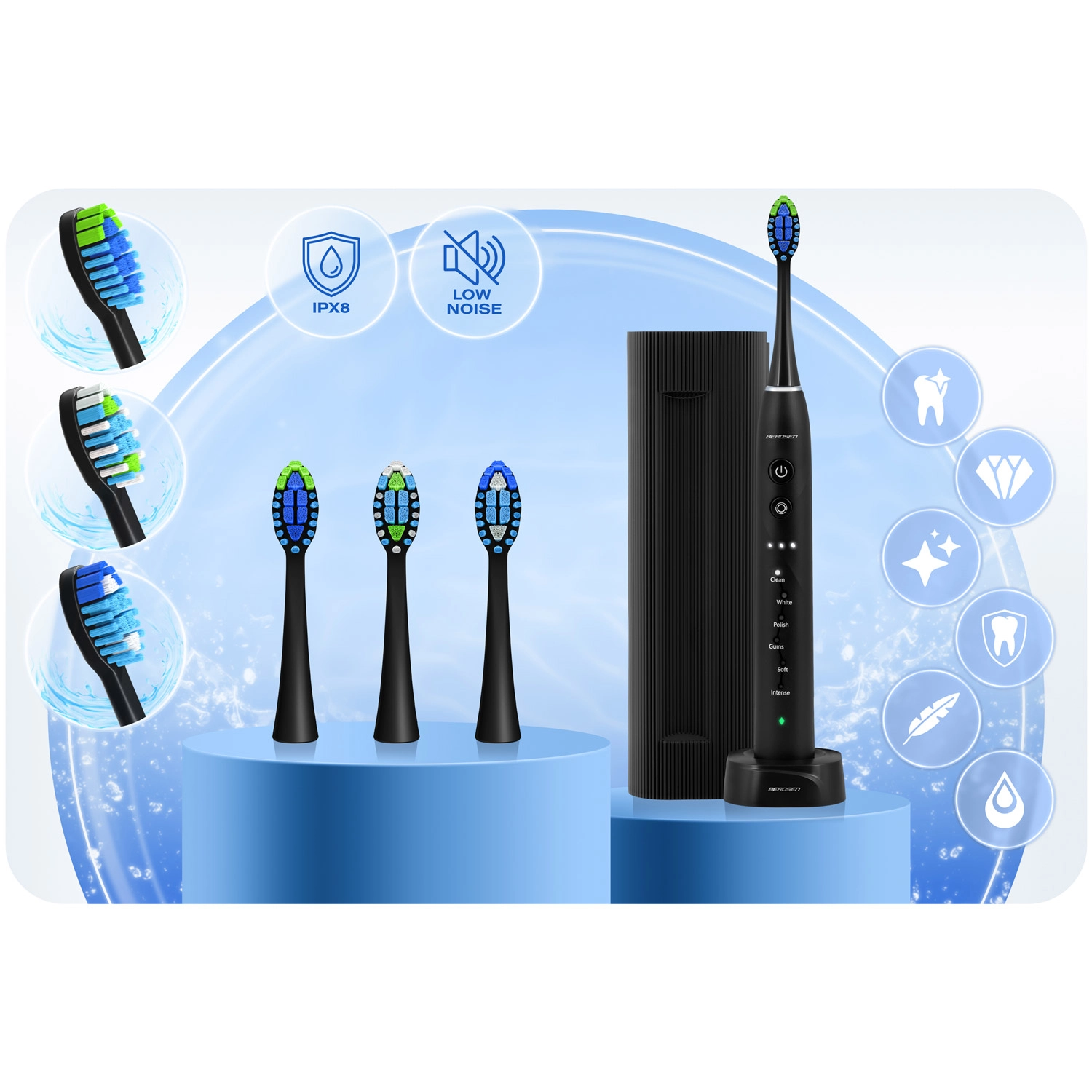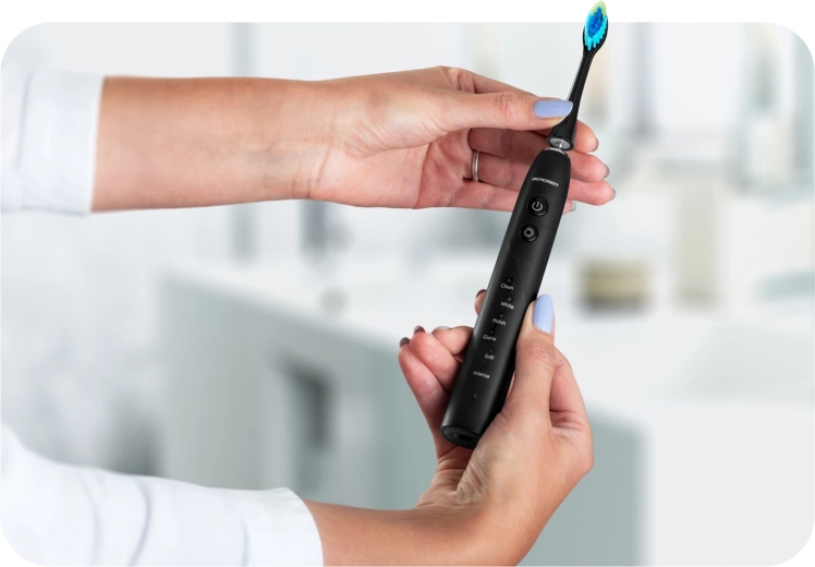 De sonische technologie van de Berdsen Galaxy dringt door tot moeilijk bereikbare interdentale ruimtes en helpt tot 6× meer tandplak te verwijderen dan een handtandenborstel. De speciaal gevormde borstelkop met zachte, dunne haren past zich aan elke tand aan en met de achterzijde reinig je gemakkelijk ook de tong voor een langdurig frisse adem. Het stijlvolle zwarte design wordt aangevuld met een ergonomische handgreep en een stille, professionele werking.