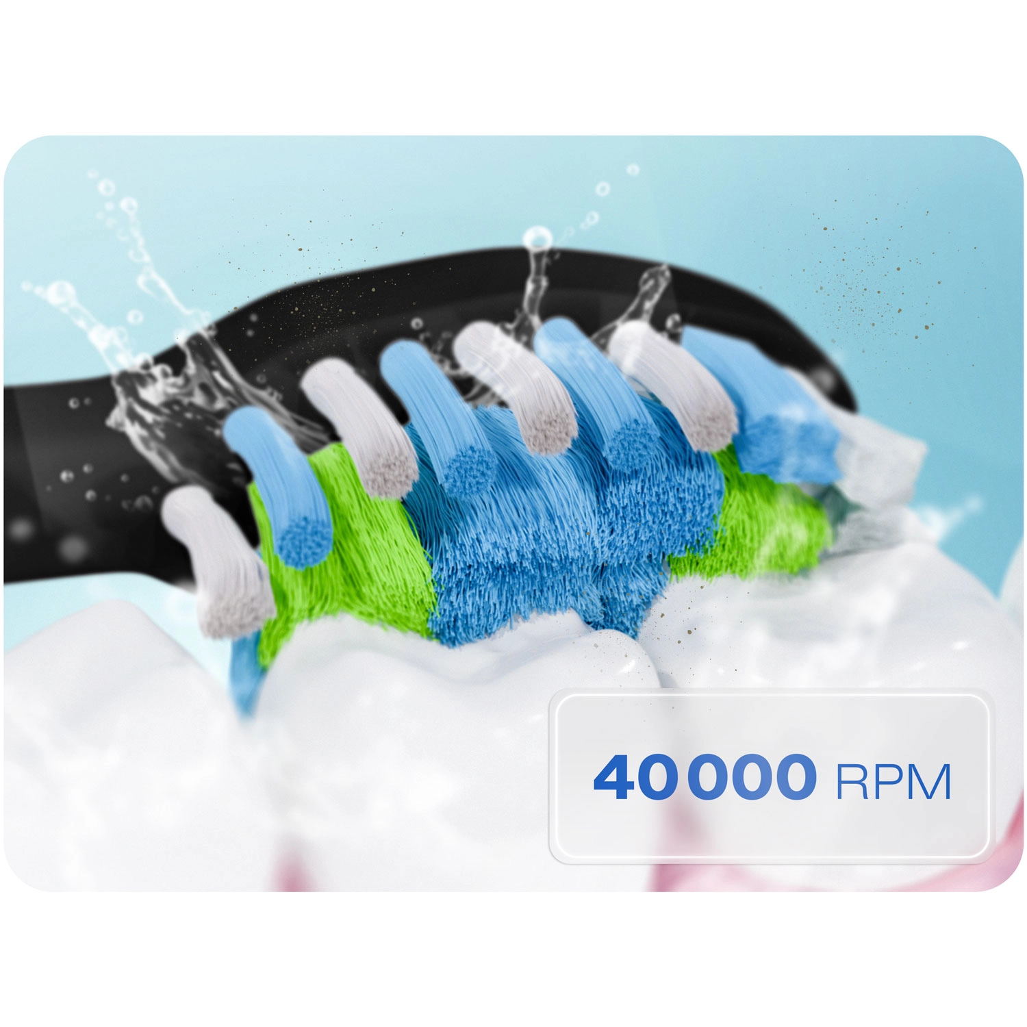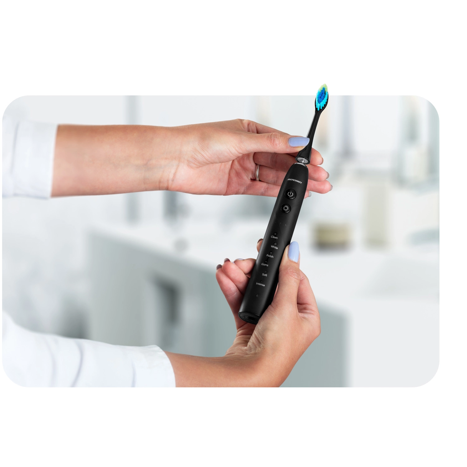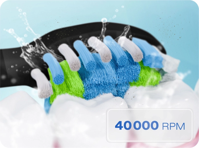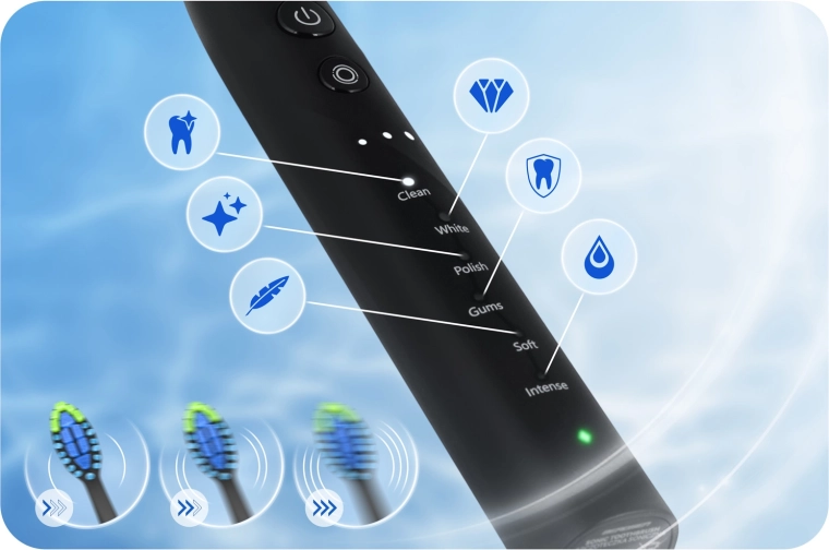 Kies uit 18 reinigingscombinaties – 6 standen (CLEAN, WHITE, POLISH, GUMS, SOFT, INTENSE) en 3 intensiteitsniveaus voor perfecte afstemming op jouw behoeften. De krachtige motor met 40.000 vibraties/min breekt effectief tandplak en verkleuringen af, terwijl de 2-minuten timer met 30-seconden interval je helpt de mond in kwadranten te verdelen.