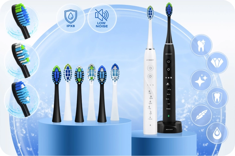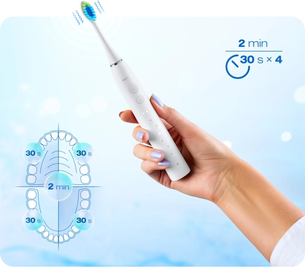 Krijg tot 18 poetscombinaties dankzij 6 modi (CLEAN, WHITE, POLISH, GUMS, SOFT, INTENSE) en 3 intensiteitsniveaus. De krachtige motor levert 40.000 trillingen/min en de batterij met een capaciteit van 800 mAh zorgt voor tot 50 dagen gebruik op één lading. Inclusief een 2‑minuten timer met 30‑seconden interval voor kwadrantwissel en IPX8-waterdichtheid voor veilig gebruik in de badkamer.