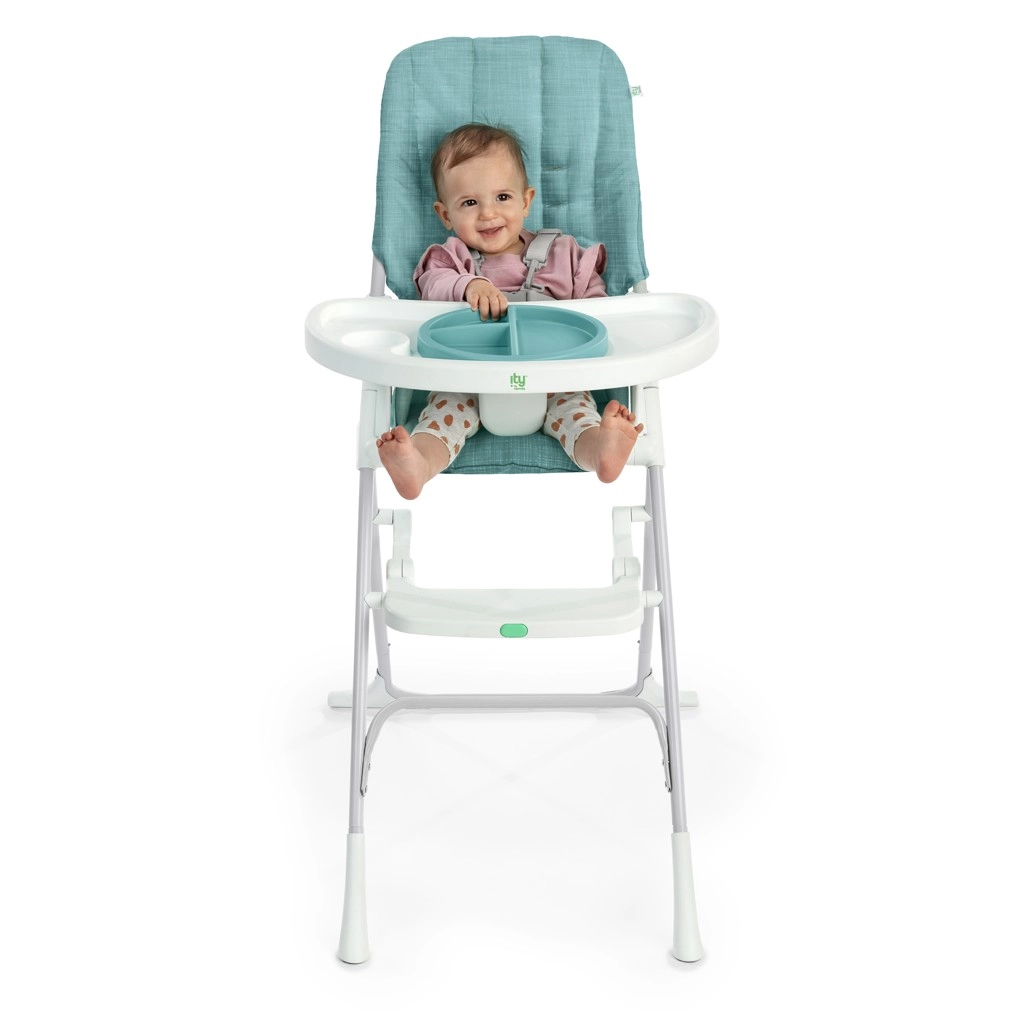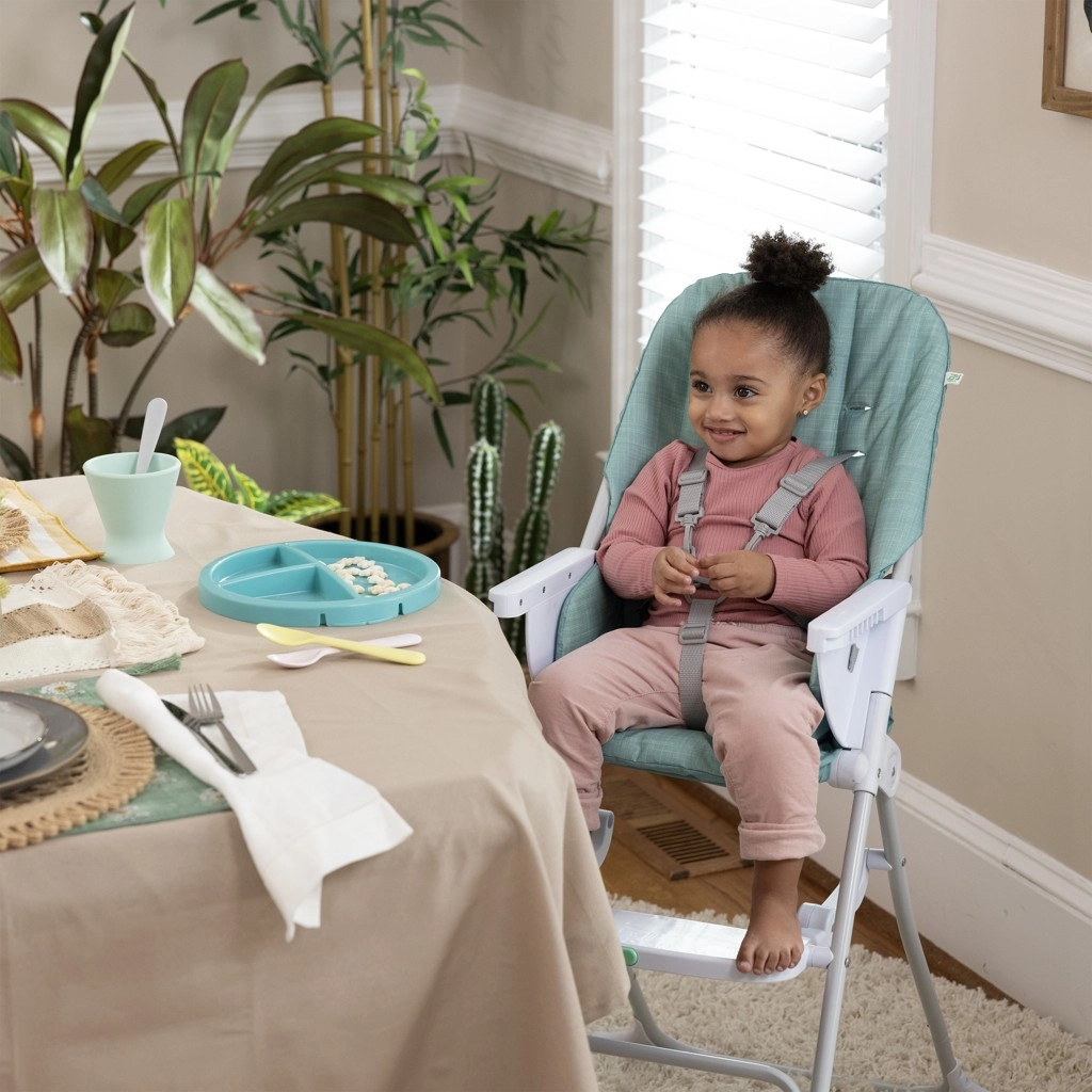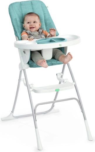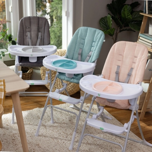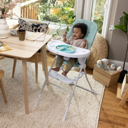 INGENUITY Sun Valley is een slimme keuze voor dagelijks voeren en de eerste zelfstandige eetpogingen aan tafel. De stoel vouwt in een handomdraai plat en blijft zelfstandig staan wanneer opgevouwen, zodat opbergen en meenemen eenvoudig is. De zachte bekleding is machinewasbaar en het grote blad met 3-traps verstelmogelijkheid kan voor ruimtebesparing aan de rugleuning worden vastgeklikt.