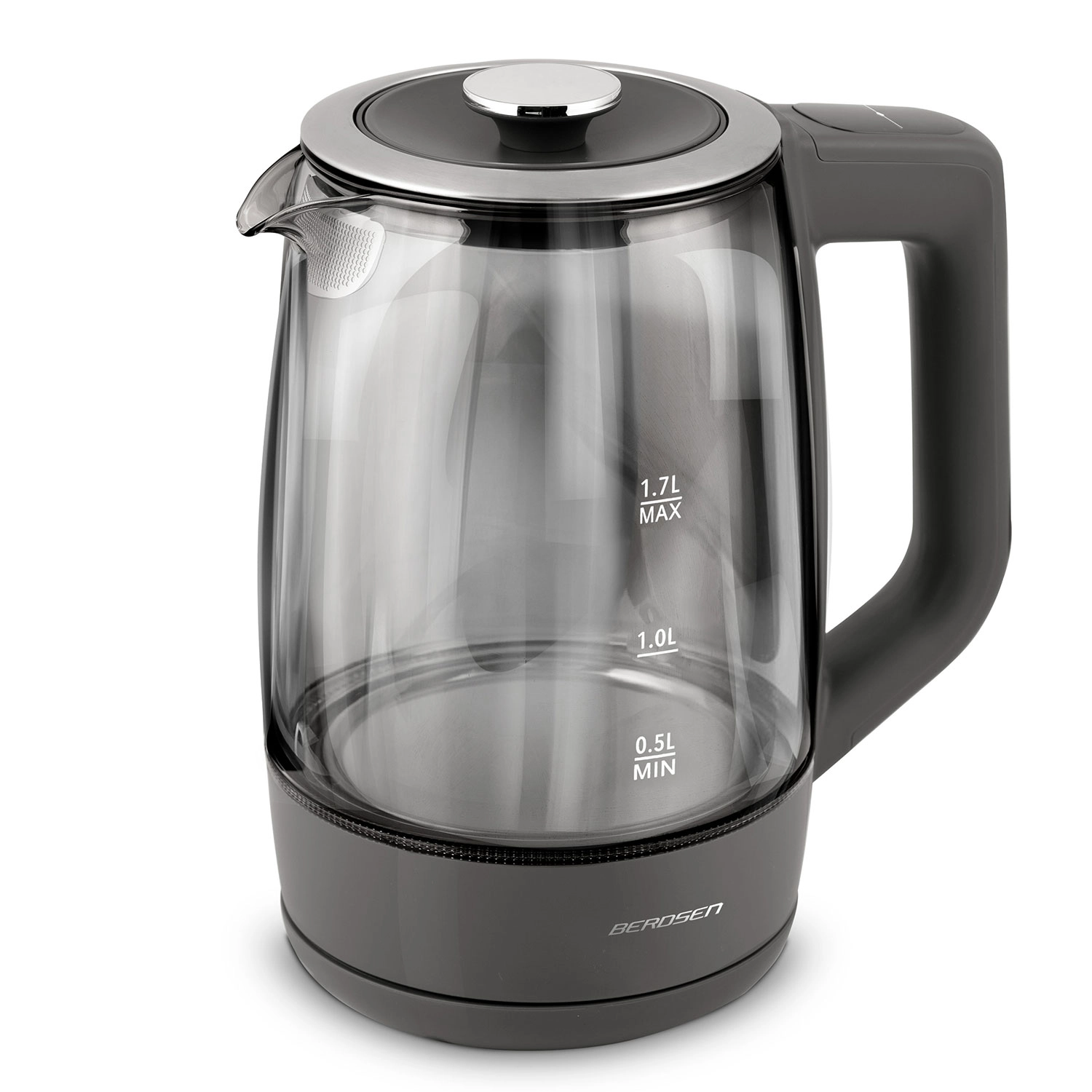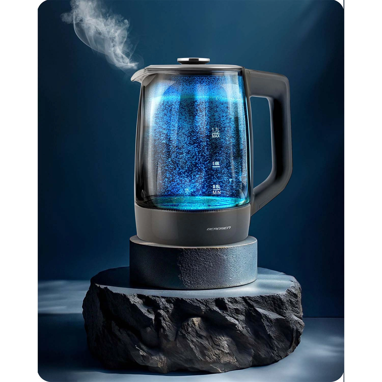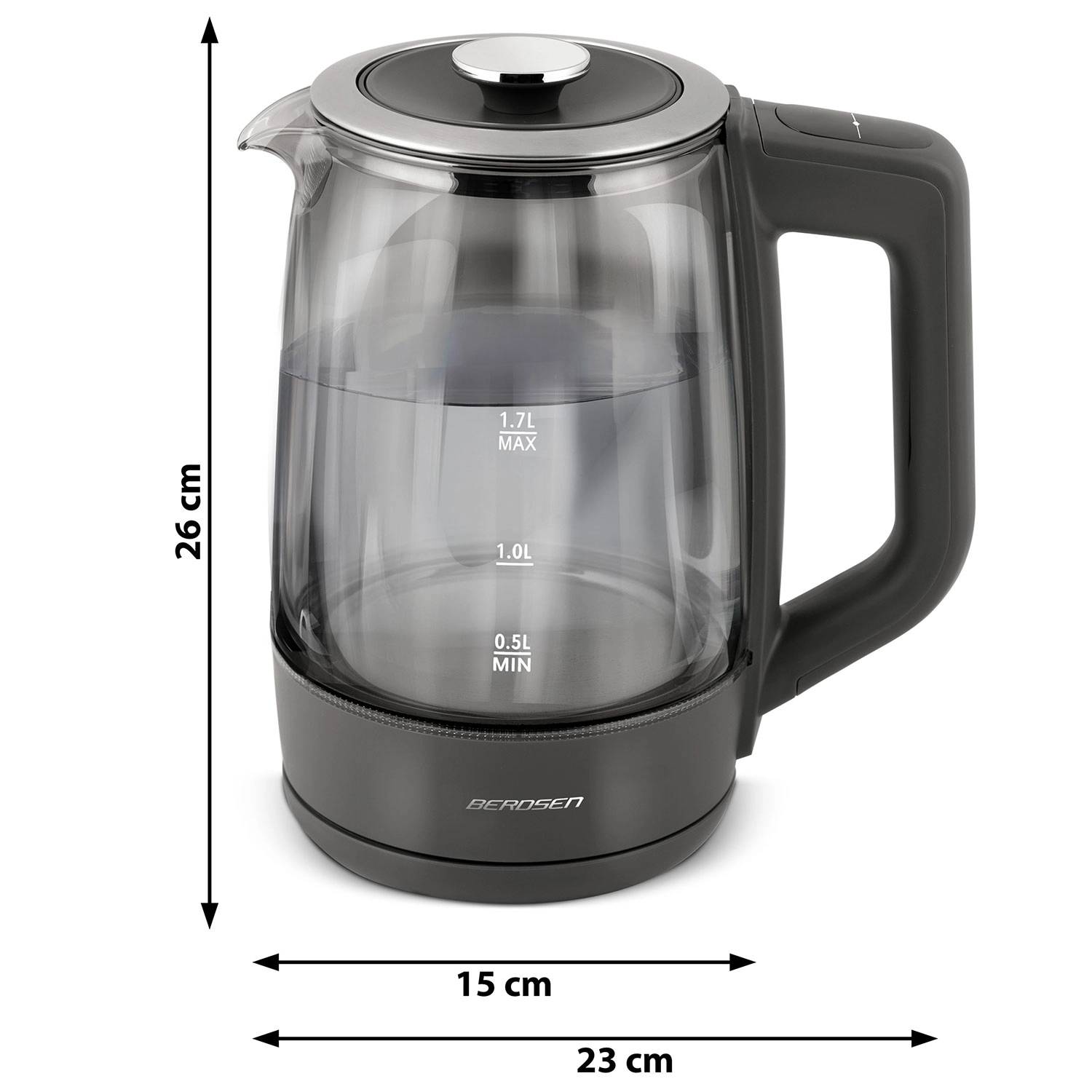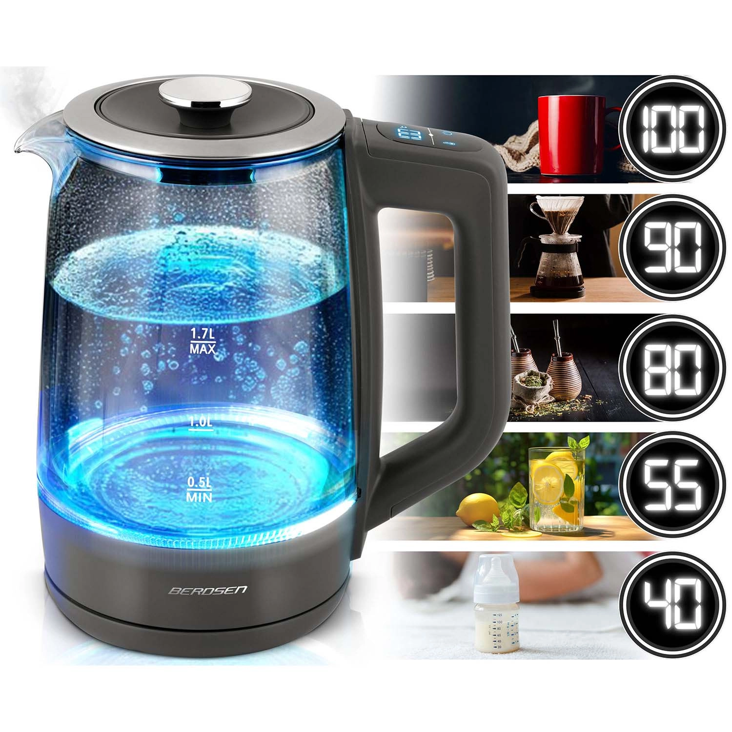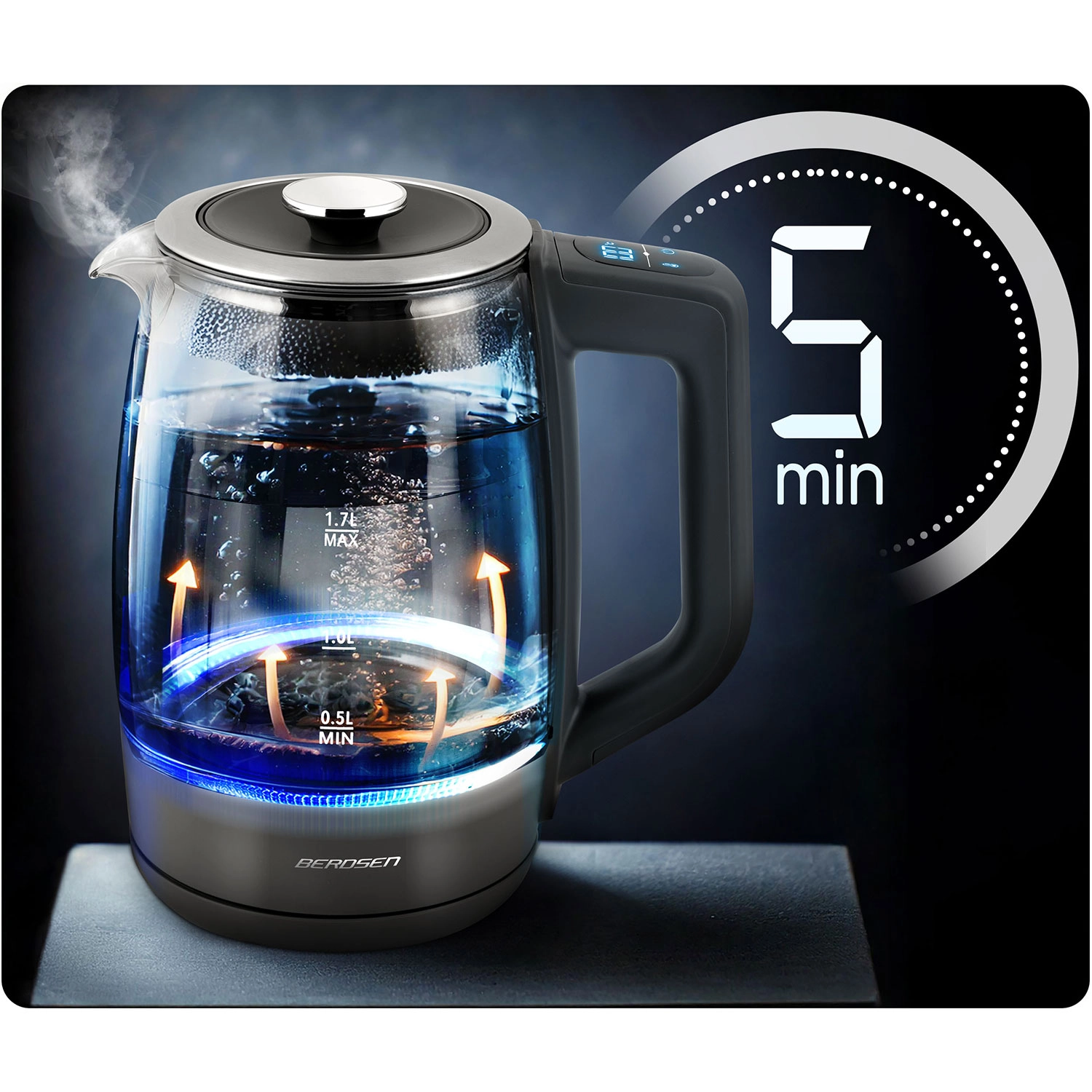 Ontdek de elegante glazen waterkoker BERDSEN 1,7 l met slimme temperatuurmeting, touchbediening en vijf traploze temperatuurinstellingen 40/55/80/90/100 °C. Het duurzame borosilicaatglas, blauwe LED-verlichting tijdens het koken en de Keep Warm-functie tot 2 uur maken het tot een ideale keuze voor thee, koffie en drankjes voor kinderen. Veilige werking dankzij droogkookbeveiliging en betrouwbare elektronica Powered by Strix.