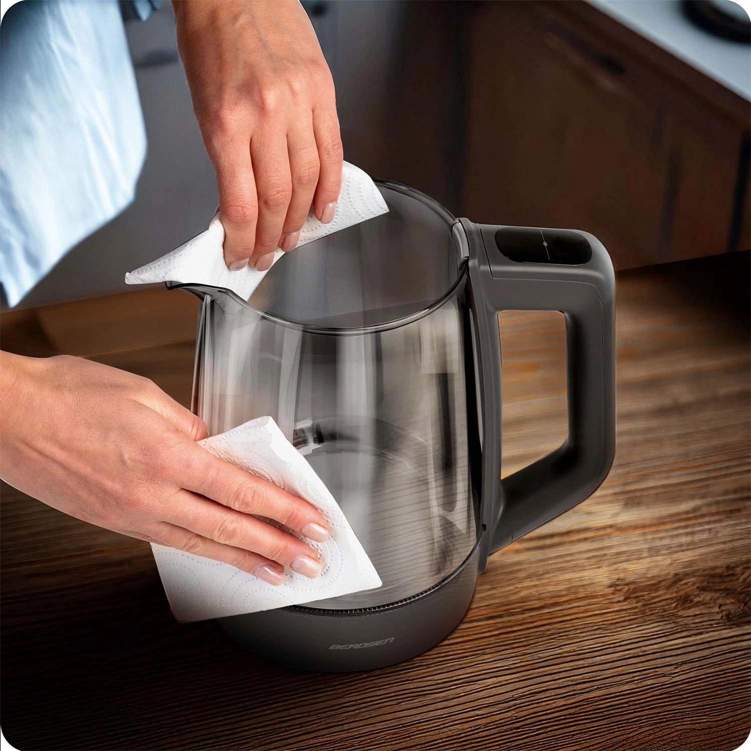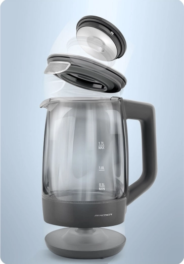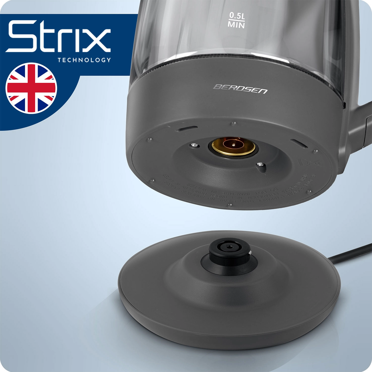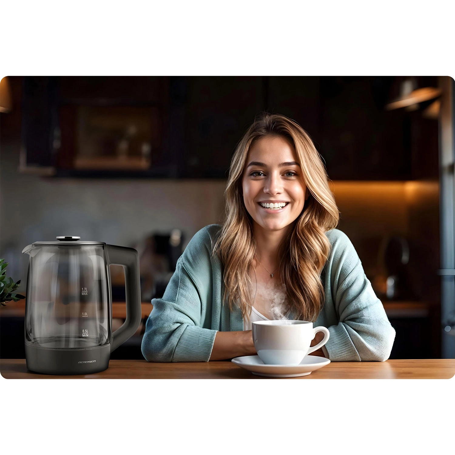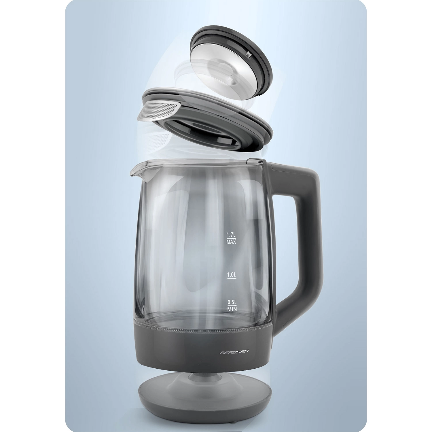 Ontdek de elegante glazen waterkoker BERDSEN 1,7 l met slimme temperatuurmeting, touchbediening en vijf traploze temperatuurinstellingen 40/55/80/90/100 °C. Het duurzame borosilicaatglas, blauwe LED-verlichting tijdens het koken en de Keep Warm-functie tot 2 uur maken het tot een ideale keuze voor thee, koffie en drankjes voor kinderen. Veilige werking dankzij droogkookbeveiliging en betrouwbare elektronica Powered by Strix.