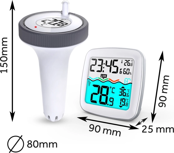 De drijvende sensor meet nauwkeurig de watertemperatuur, terwijl de binnenunit de comfortniveau-indicator, het sensorkanaal en de min/max-waarden voor langdurige monitoring weergeeft. Het compacte, glanzend witte design past perfect in een moderne omgeving en dankzij de batterijvoeding is de installatie zo geregeld.