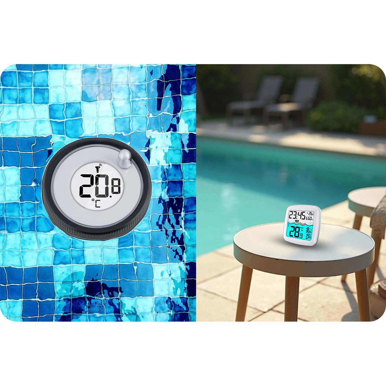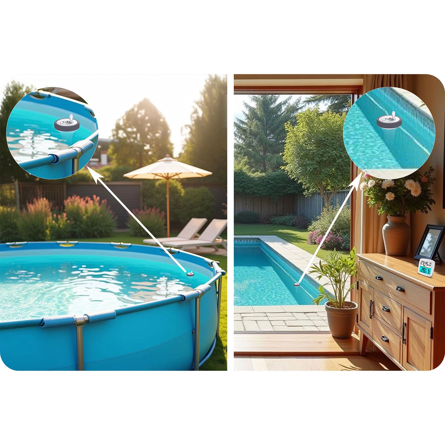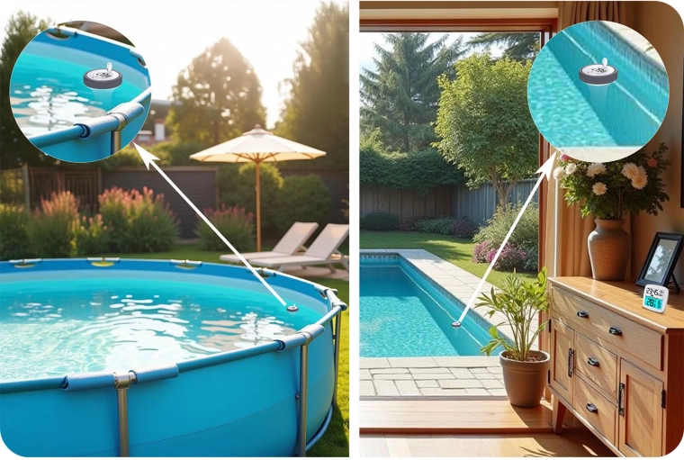 De drijvende sensor volgt nauwkeurig de watertemperatuur en verzendt de gegevens naar de binnenunit – ideaal voor thuiszwembaden en bubbelbaden.