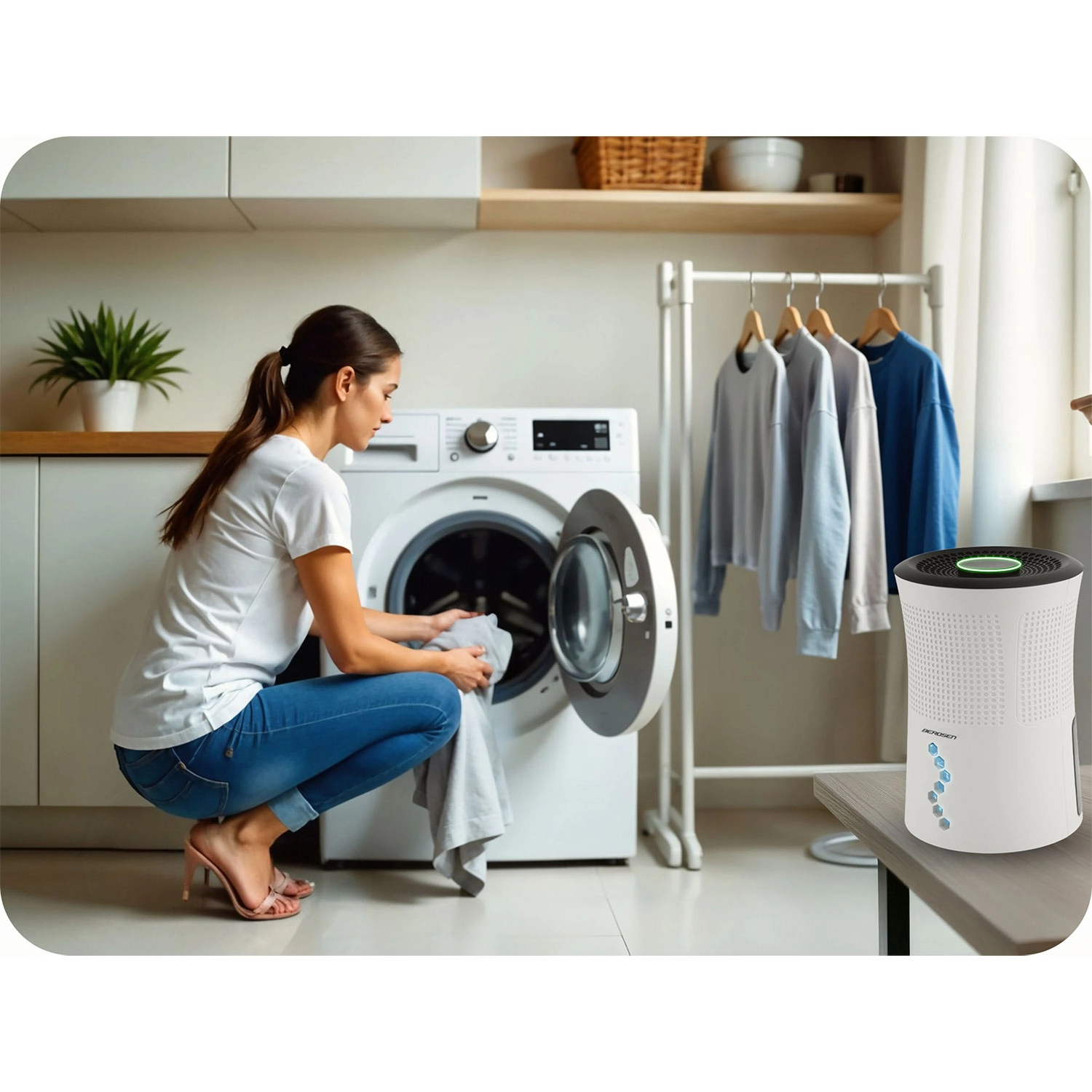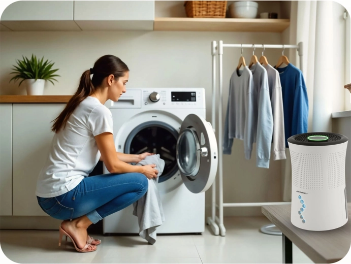 De ontvochtiger beperkt de groei van schimmels, bacteriën en huisstofmijten, verbetert de luchtkwaliteit en helpt allergieën en onaangename geuren in huis te voorkomen.