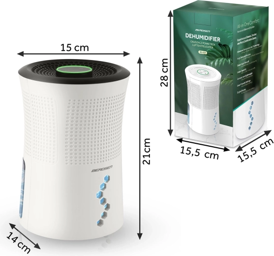 De compacte BERDSEN BD-527 luchtontvochtiger zorgt thuis voor een gezond binnenklimaat en vermindert doeltreffend overtollige vochtigheid. Hij biedt stille werking tot 34 dB, een grote tank van 700 ml, Peltier-technologie met laag verbruik van 22,5 W en decoratieve LED-achtergrondverlichting met mogelijkheid tot uitschakelen. Ideaal voor badkamer, wasruimte en kleinere kamers om schimmel, geurtjes te voorkomen en was sneller te laten drogen.