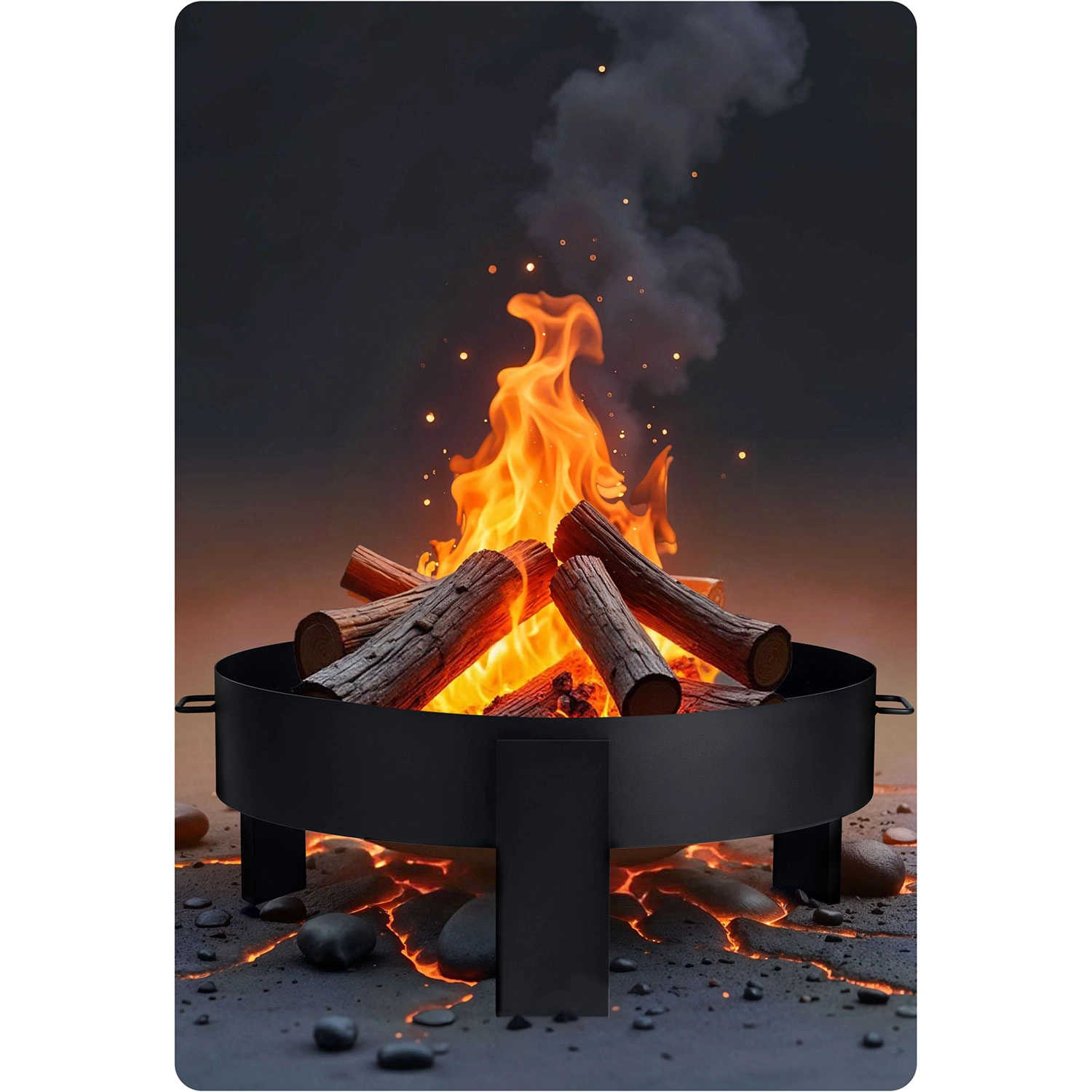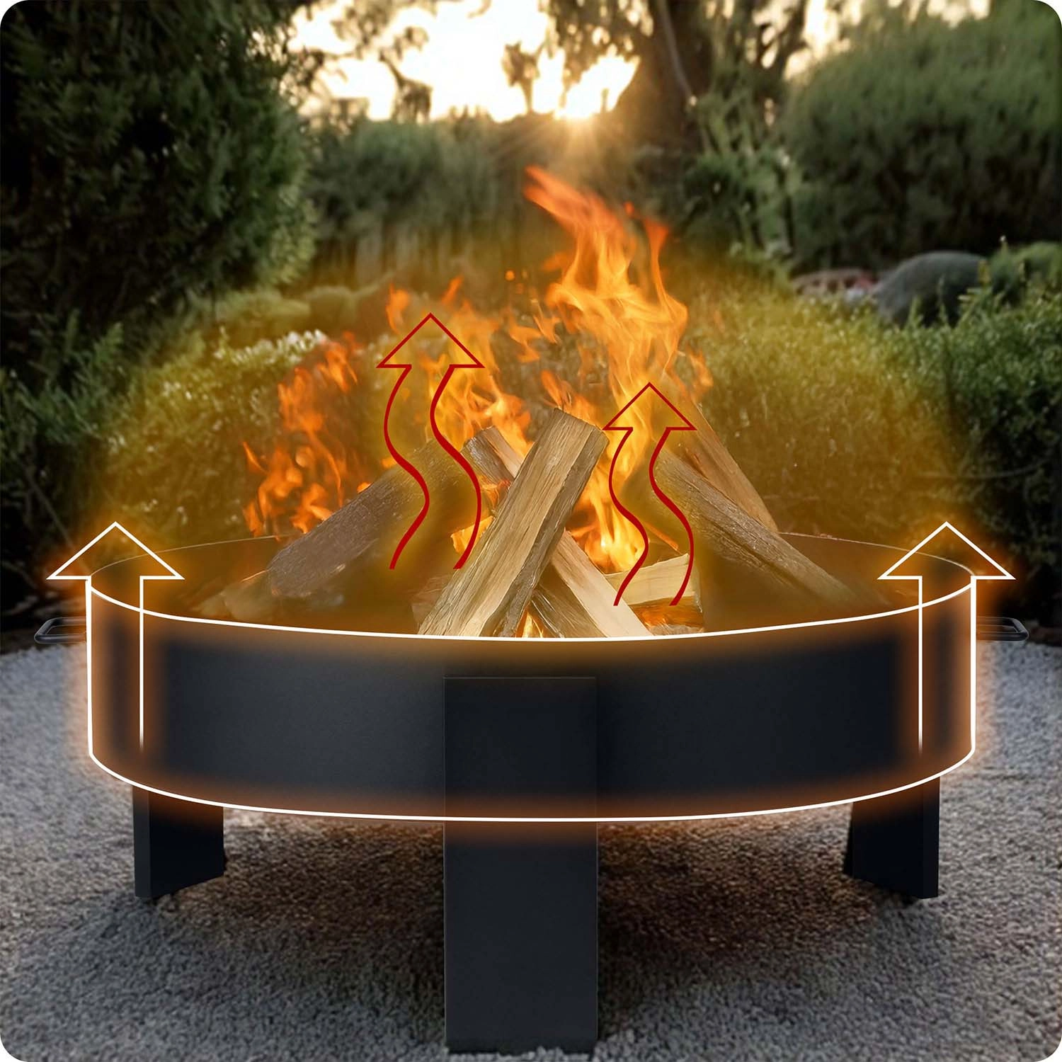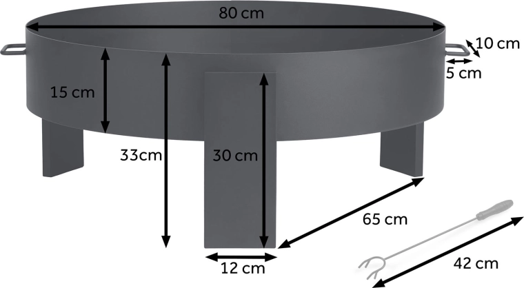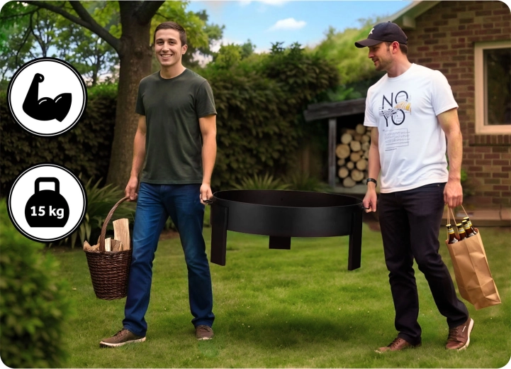 De massieve stalen constructie van 2 mm plaatstaal staat stevig op drie poten en zorgt voor stabiliteit en veiligheid. Zijhandgrepen vergemakkelijken het dragen en in de verpakking vind je bovendien een pook met handgreep voor comfortabel verplaatsen van houtblokken. Het minimalistische, universele design past in zowel moderne als traditionele tuinen en voegt zich moeiteloos naar elke buitenstijl.