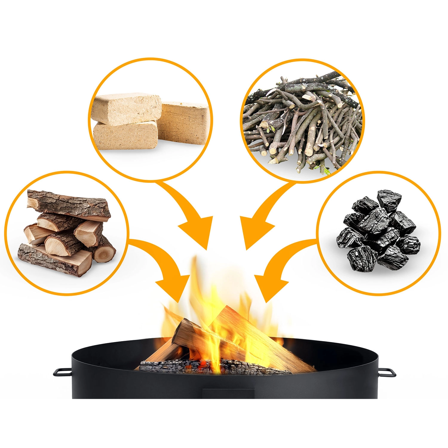 Stook met haardhout, houtbriketten, takken of houtskool. De zijhandgrepen maken verplaatsen makkelijker, en in de verpakking zit bovendien een praktische pook voor veilig gebruik.