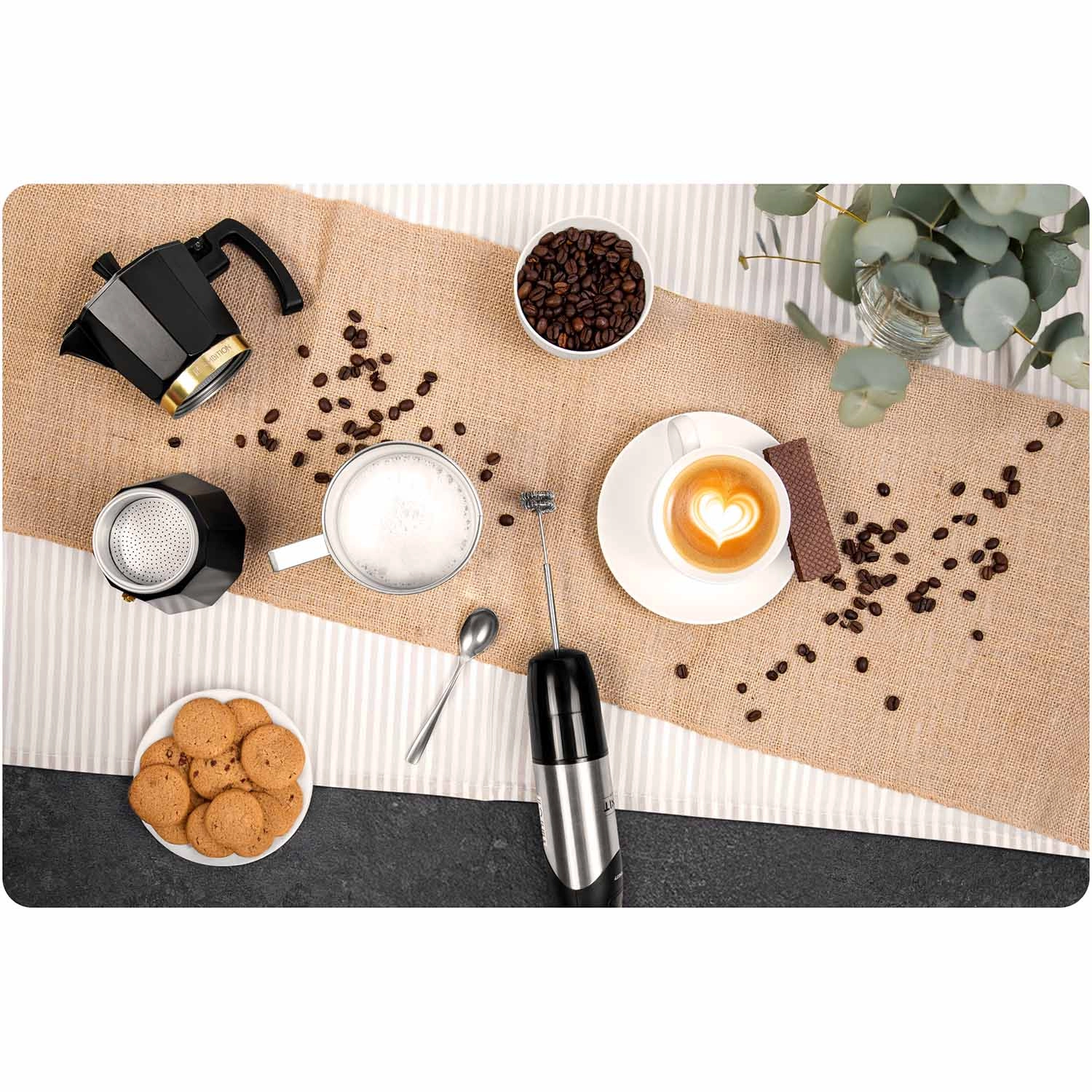 In de verpakking vind je een staafopzetstuk, garde, dubbele gardes, kneedhaken, een hakmolen van 600 ml, een maatbeker van 1000 ml met deksel en een melkopschuimer – alles klaar voor dagelijks koken.
