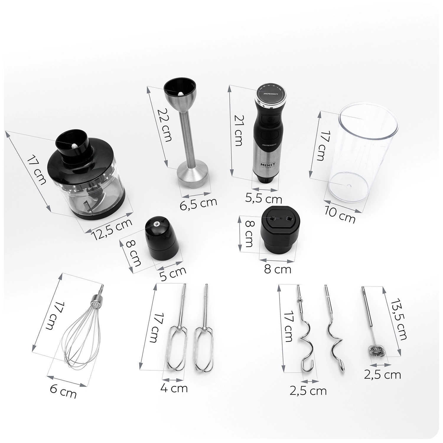 Krachtige Berdsen staafmixer met een motor van 1500 W en TURBO-functie die kan mixen, hakken, kloppen en kneden. Duurzaam titanium mes, tot 20 snelheden, roestvrijstalen INOX-constructie, comfortabele rubberen grip en een rijke set opzetstukken inclusief garde, kneedhaken, dubbele gardes, mini-hakker 600 ml, maatbeker 1000 ml met deksel en een melkopschuimer voor perfecte latte.
