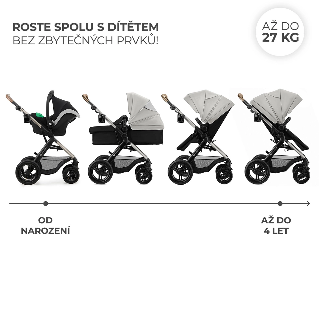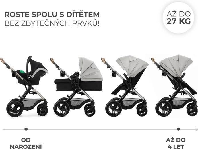 In de set zit alles wat je nodig hebt: muskietennet, regenhoes, universele voetenzak (voor reiswieg en sportzitje), oudertas, bekerhouder en adapters. Voor de veiligheid zorgen de 5-puntsgordel, draaibare veiligheidsbeugel en de centrale STOP & RIDE-rem.