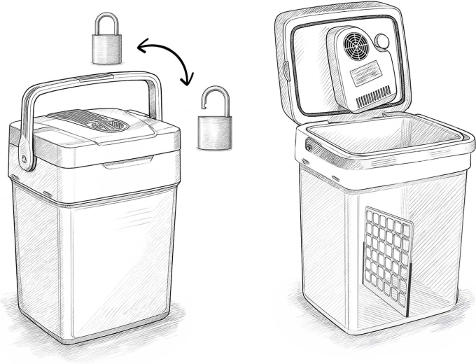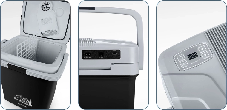 Dankzij de dual‑power 12 V / 230 V gebruik je hem zowel in de auto als thuis. Dubbele wanden en een actieve ventilator zorgen voor een gelijkmatige luchtcirculatie en stabiele temperatuur. Doordachte details zoals de inklapbare handgreep, vergrendeling van het deksel tijdens het dragen, steunfunctie van de handgreep tijdens het vullen en het uitneembare scheidingsrooster verhogen het comfort en de veiligheid.