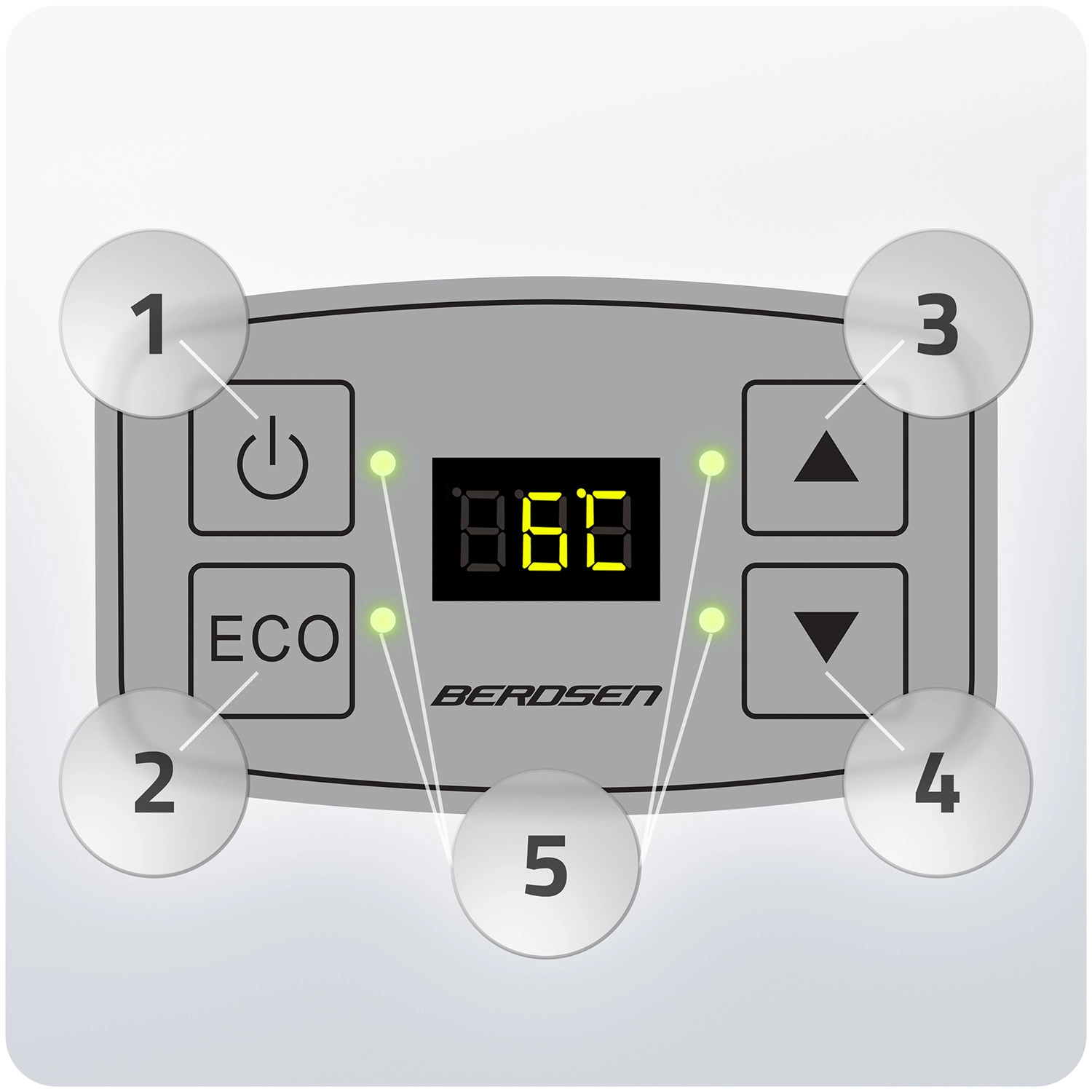 - Elektronisch paneel, temperatuurinstelling, ON/OFF‑knop, indicatoren