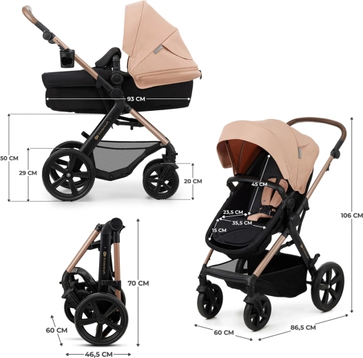 Voor het comfort van je kindje is er een vergrootbare kap met UPF50+, verstelbare rugleuning en voetensteun, een zachte inleg in de reiswieg en 5-puntsgordels. Ouders waarderen de verstelbare duwbeugel, de ruime mand tot 5 kg, de centrale STOP & RIDE-rem en het snelle inklappen van het frame. Het design combineert tijdloze elegantie met duurzame materialen die het dagelijkse gebruik aankunnen.