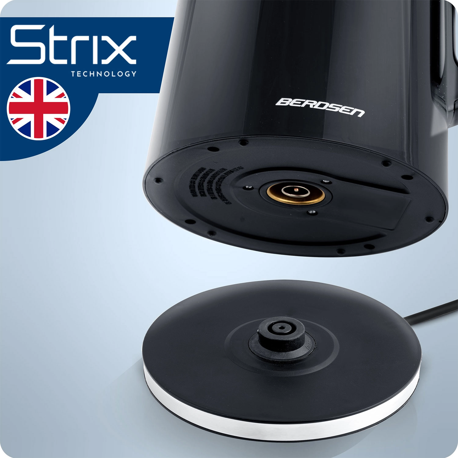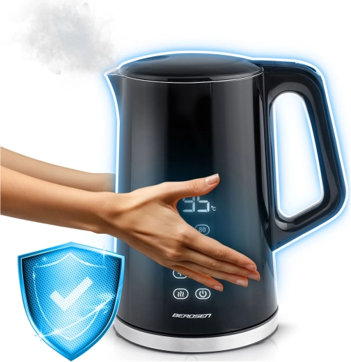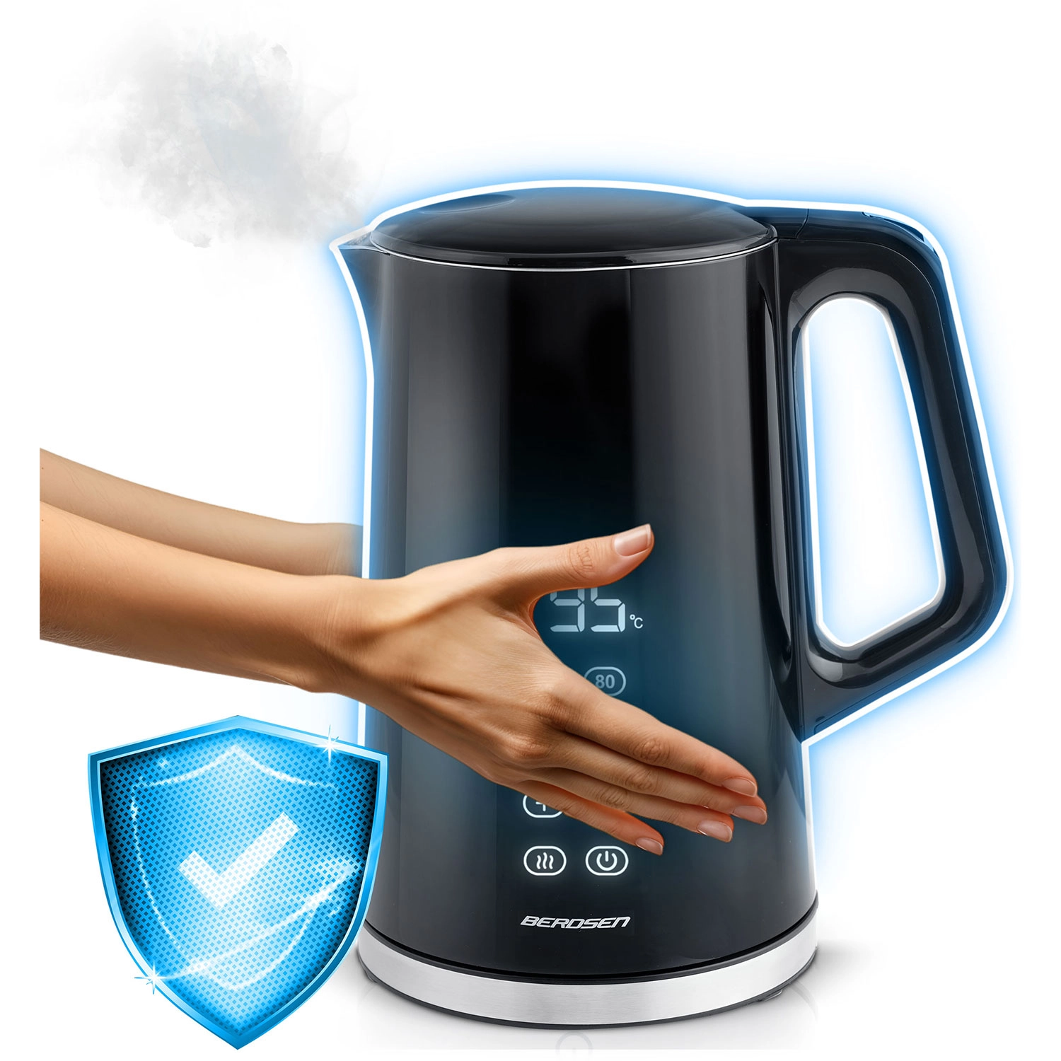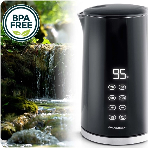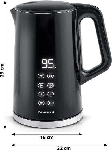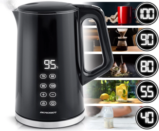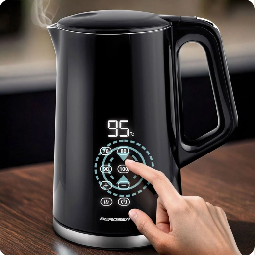 Stijlvolle elektrische waterkoker van BERDSEN met een inhoud van 1,7 l biedt nauwkeurige temperatuurinstelling per 5 °C (70–100 °C), slimme meting met een nauwkeurigheid van 1 °C, warmhoudfunctie tot 2 uur en stille, snelle verwarming. De dubbellaagse CoolTouch-constructie beschermt tegen verbranding, terwijl het roestvrijstalen binnenwerk van SUS 304 zorgt voor een zuivere smaak van het water en een lange levensduur. Het touchpaneel met achtergrondverlicht display maakt de bediening eenvoudig en het moderne ontwerp past perfect in elke keuken.