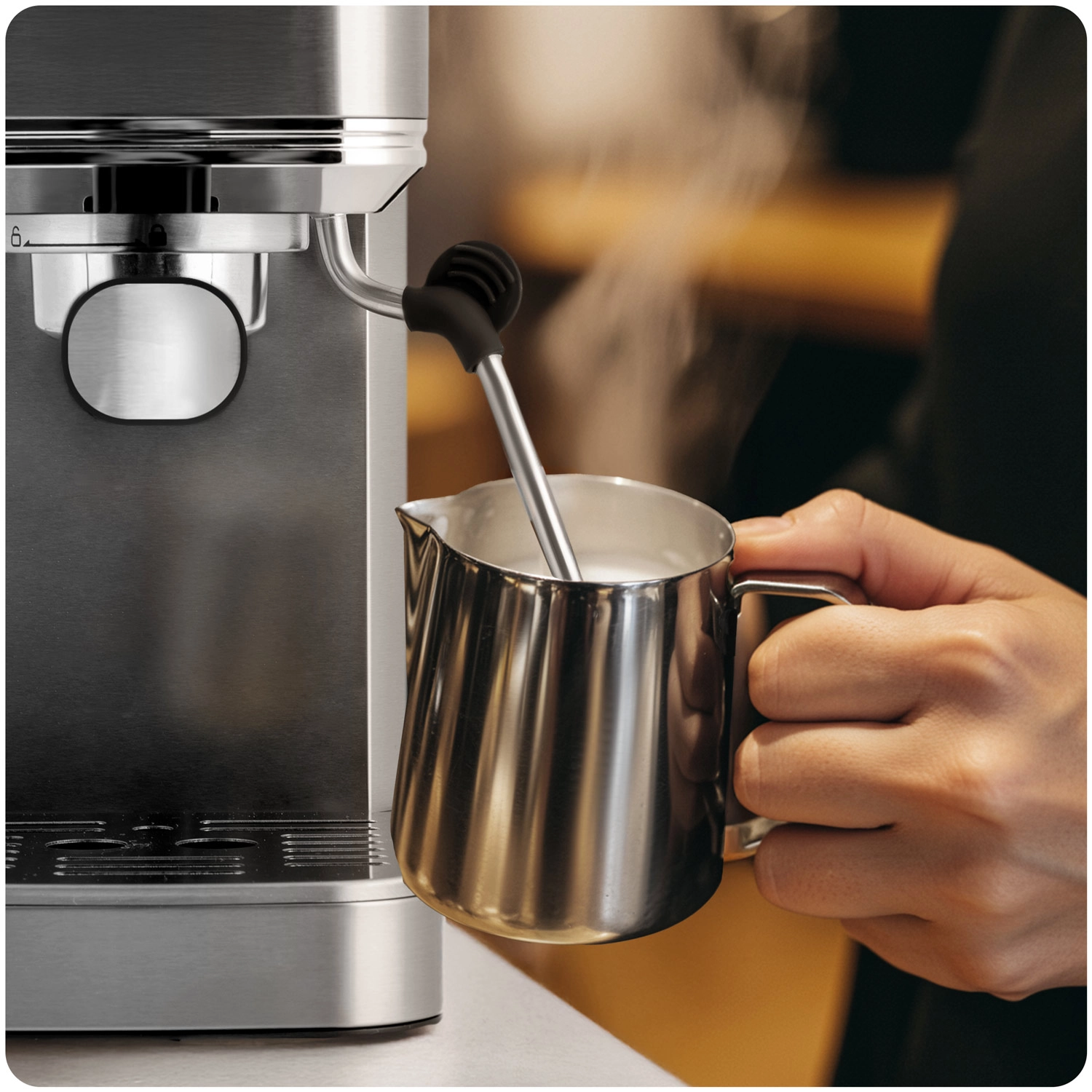De robuuste roestvrijstalen behuizing is duurzaam en eenvoudig te reinigen. De professionele stoompijp zorgt voor dik, romig schuim voor cappuccino, latte en flat white. Het 1,2 l reservoir, de lekbak en de afneembare pijp maken het onderhoud aanzienlijk eenvoudiger. In de verpakking vind je ook 2 filters (single/double) en een praktische 2-in-1 maatschep met tamper voor nauwkeurig doseren en aandrukken van de koffie.