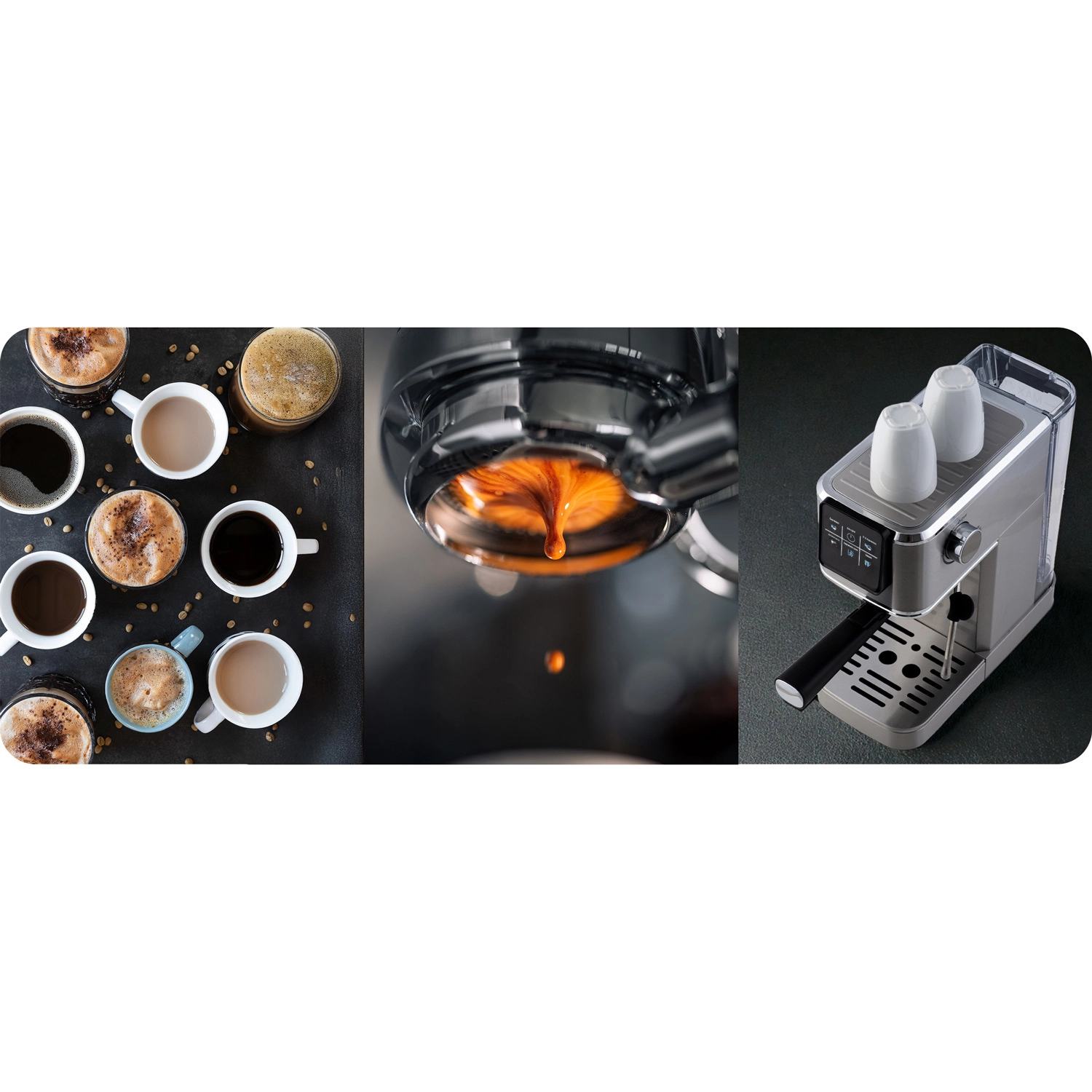 Krachtige hendel-espressomachine met 20 bar druk en 1350 W vermogen voor een intens aroma en een rijke crema zoals in een koffiezaak. Touchpanel voor eenvoudige bediening, een professionele stoompijp voor zijdezachte melkschuim en een afneembaar waterreservoir van 1,2 l voor comfortabel dagelijks gebruik. Bovendien is er de cold espresso-functie voor ijskoffiespecialiteiten en een stille, betrouwbare behuizing van roestvrij staal.
