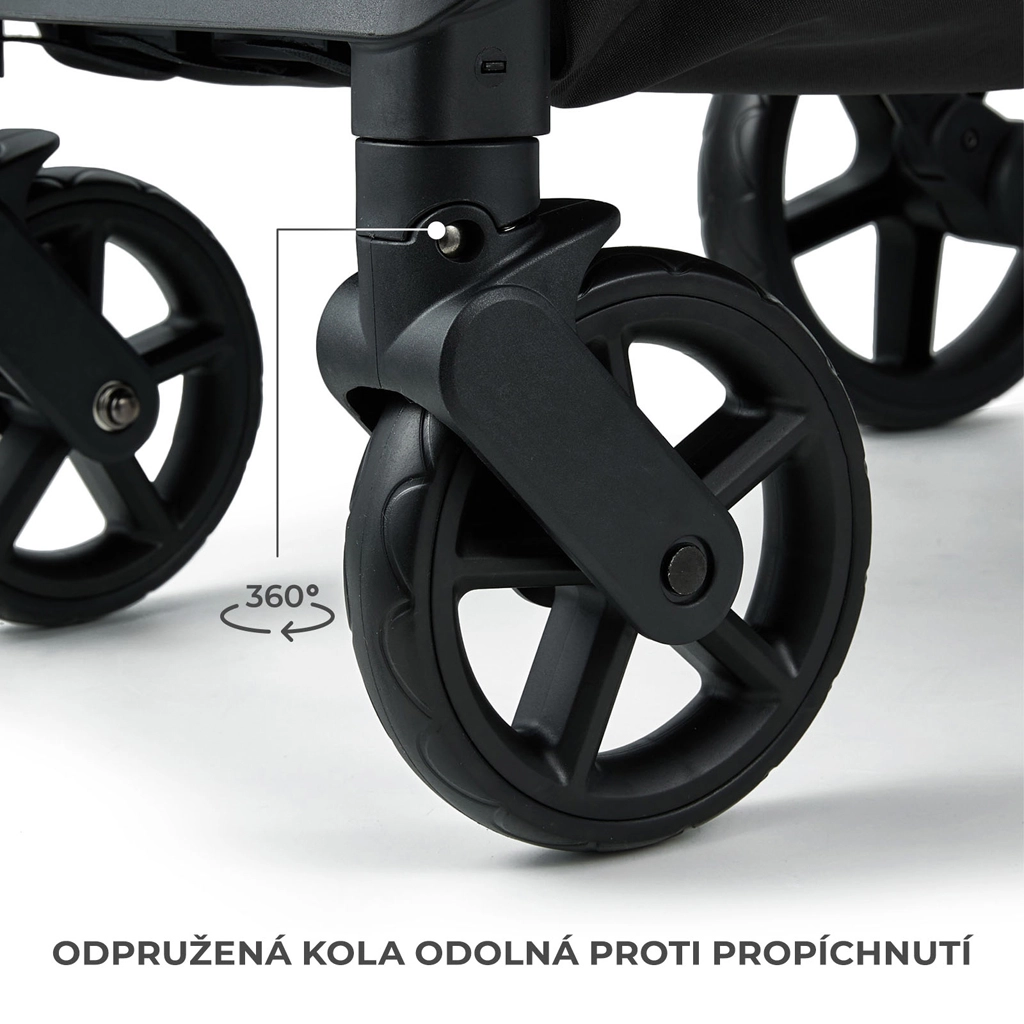 Grote achterwielen en zwenkende voorwielen zorgen voor een soepele rit en eenvoudig manoeuvreren, zelfs in smalle steegjes.