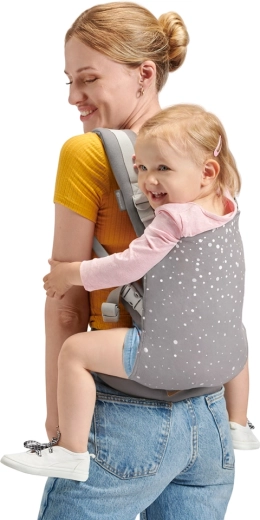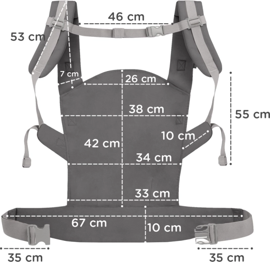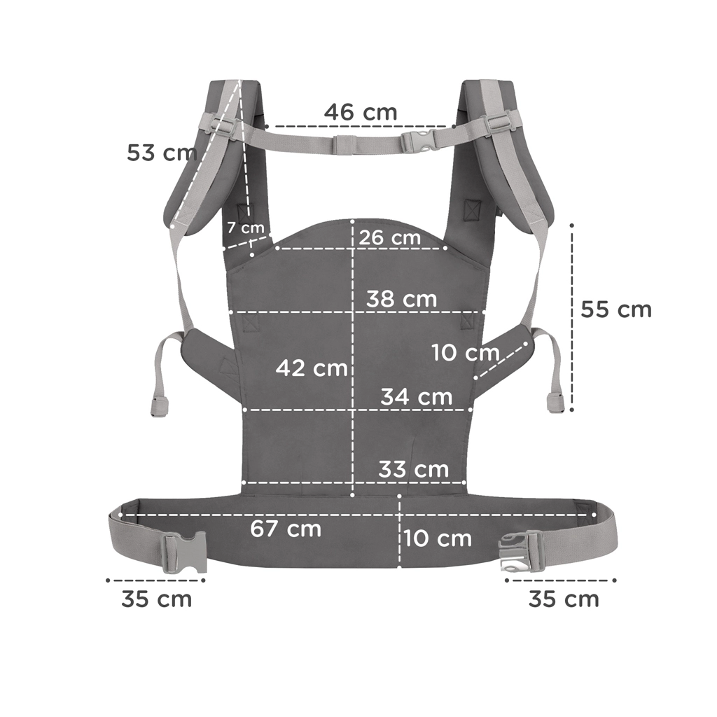 De brede heupband (10 cm) en de gewatteerde schouderriemen verdelen het gewicht van het kind en verhogen het comfort, ook bij langer dragen. Elastieken houden de uiteinden van de riemen veilig op hun plek.