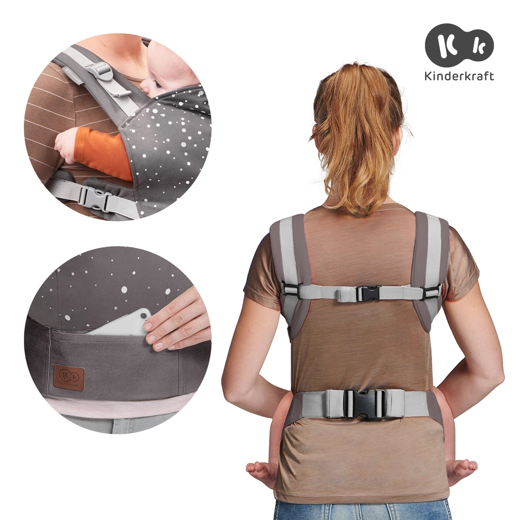 De Kinderkraft Nino draagzak is ontworpen met focus op veiligheid, ergonomie en comfort voor ouder en kind. Het innovatieve paneel met traploze hoogteverstelling past zich aan de groei van het kind aan, terwijl de brede en zachte heupband samen met gewatteerde schouderriemen voor een comfortabele gewichtsverdeling zorgen. Ademend 100% katoen biedt prettige ventilatie, ook bij langer dragen.