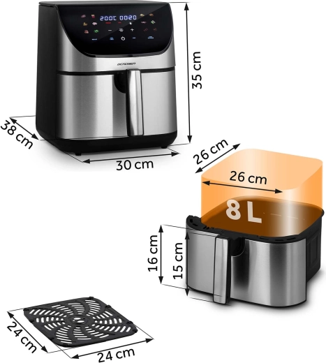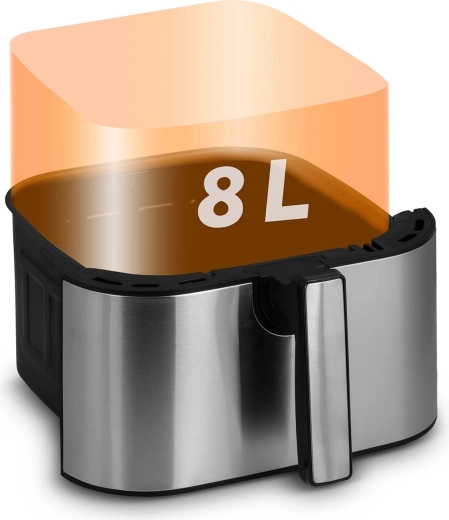 Dankzij de geavanceerde circulatie van hete lucht krijg je een goudbruine, knapperige korst buiten en sappigheid binnenin – zonder oliegeur en onnodige calorieën. Het volume van 8 liter is voldoende voor een gezinslunch, een grote portie friet voor vrienden of voor het braden van een hele kip. De binnenonderdelen met anti-aanbak PTFE kunnen in de vaatwasser.