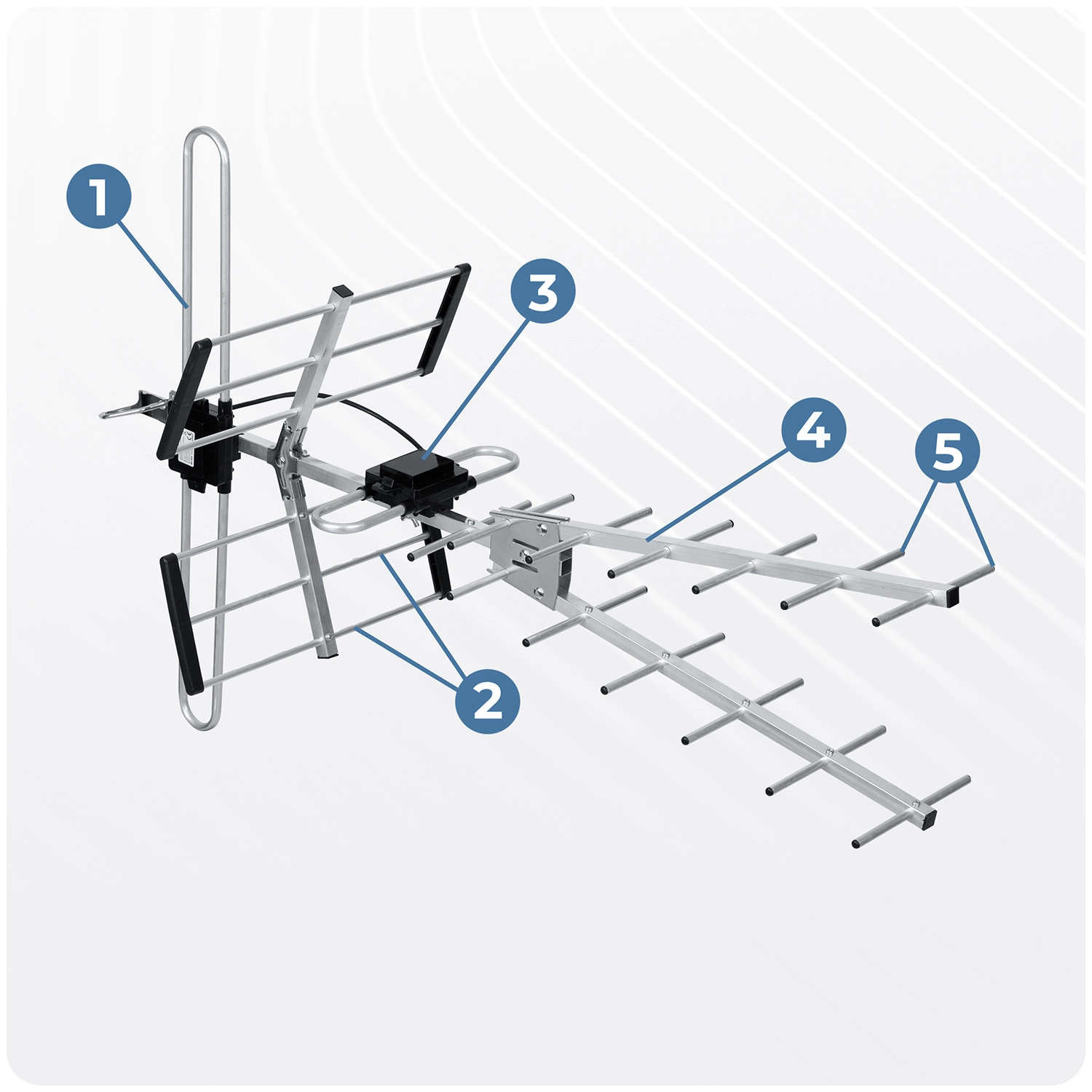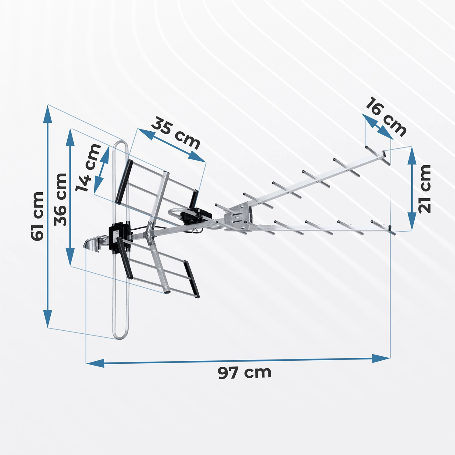 De Yagi-constructie met directoren en reflectoren levert een winst tot 16 dB en een FBR-selectiviteit ≥ 24 dB voor een zuiver signaal zonder storingen van achteraf.