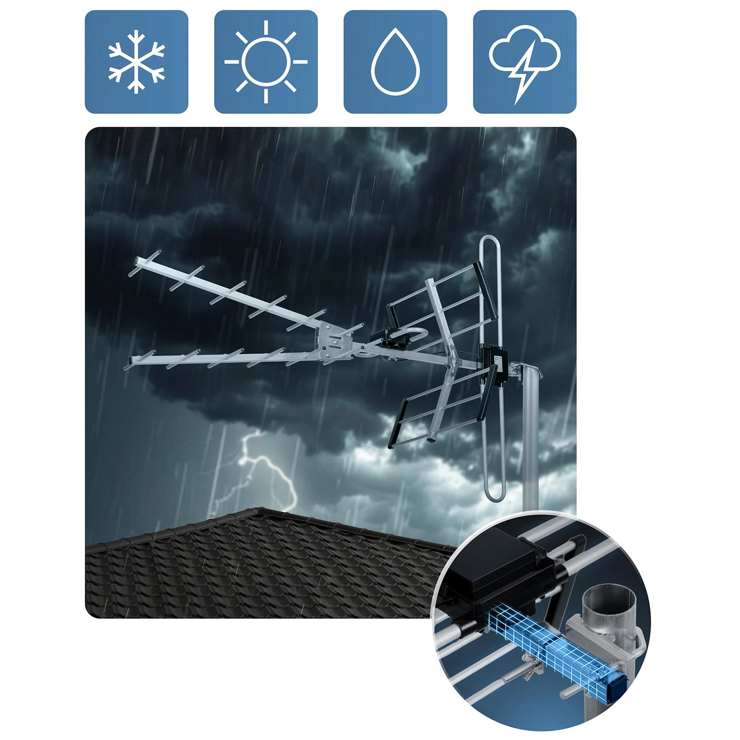 Stevige materialen en een robuuste bevestiging zorgen voor betrouwbare ontvangst het hele jaar door – van zon en regen tot sneeuw en wind.