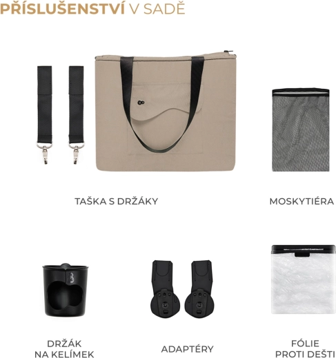 De uitrusting bevat alles wat je nodig hebt: een muskietennet (geïntegreerd in de beensteun), een regenhoes, een bekerhouder, een tas aan de duwbeugel voor ouders en adapters om een TRAVEL SYSTEM met je compatibele autostoeltje te creëren. De ruime mand met een draagvermogen van 5 kg biedt plaats aan boodschappen en reisbenodigdheden.