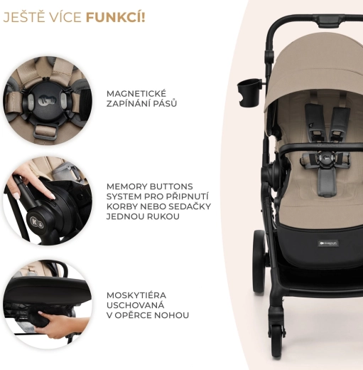 Klap de kinderwagen, ook met zitting, met één hand in. MEMORY BUTTONS vergemakkelijken het losmaken van de zitting en de magnetische gespsluiting versnelt het vastmaken van je kind.
