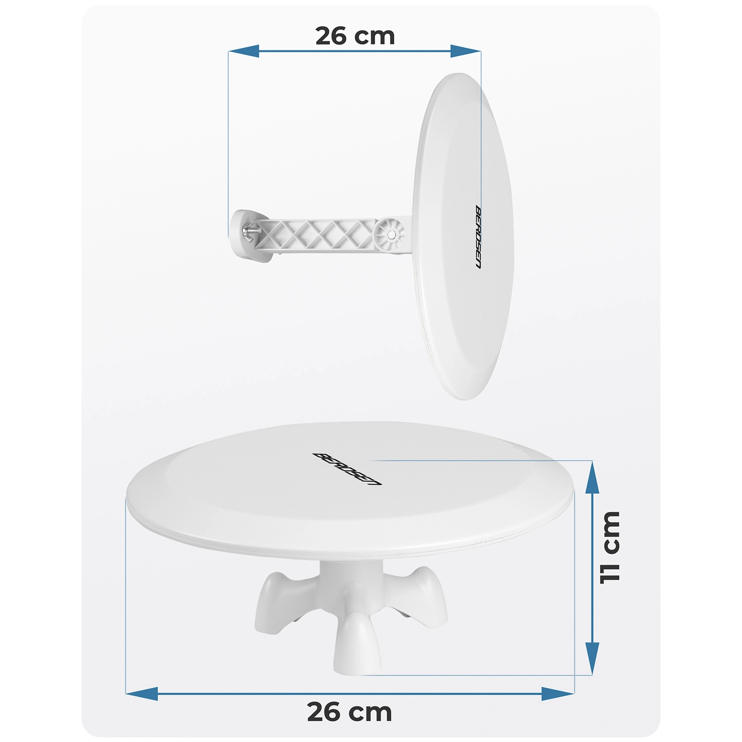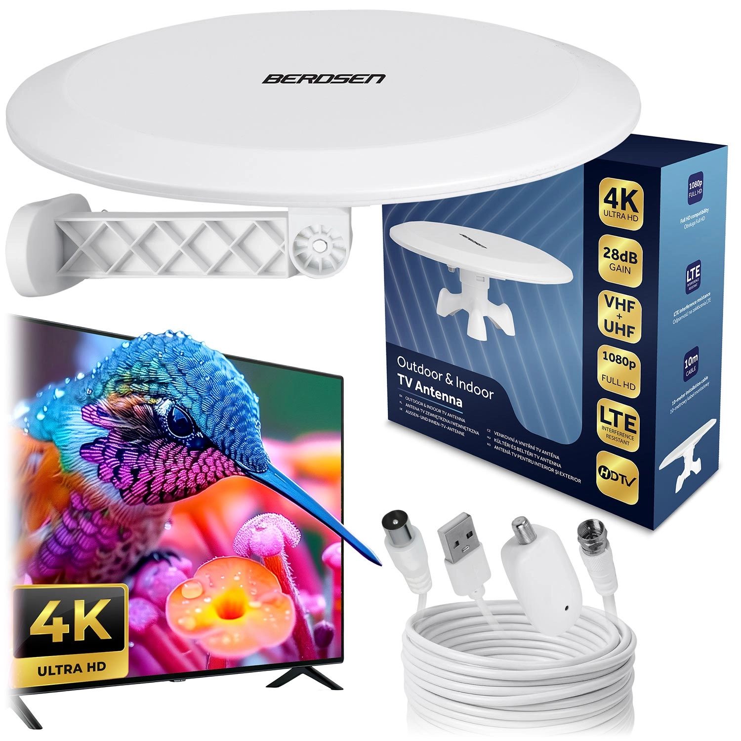 De compacte binnen-/buiten-TV-antenne van BERDSEN biedt stabiele ontvangst tot 80 km, ondersteuning voor VHF en UHF voor alle multiplexen MUX 1–8 en compatibiliteit met Full HD en Ultra HD 4K. Dankzij de actieve versterking van 28 dB en het ingebouwde LTE-filter worden storingen door mobiele netwerken geëlimineerd. Eenvoudige installatie zonder boren, voeding via USB en universele connectoren maken het een ideale oplossing voor appartement, huis en vakantiehuis.