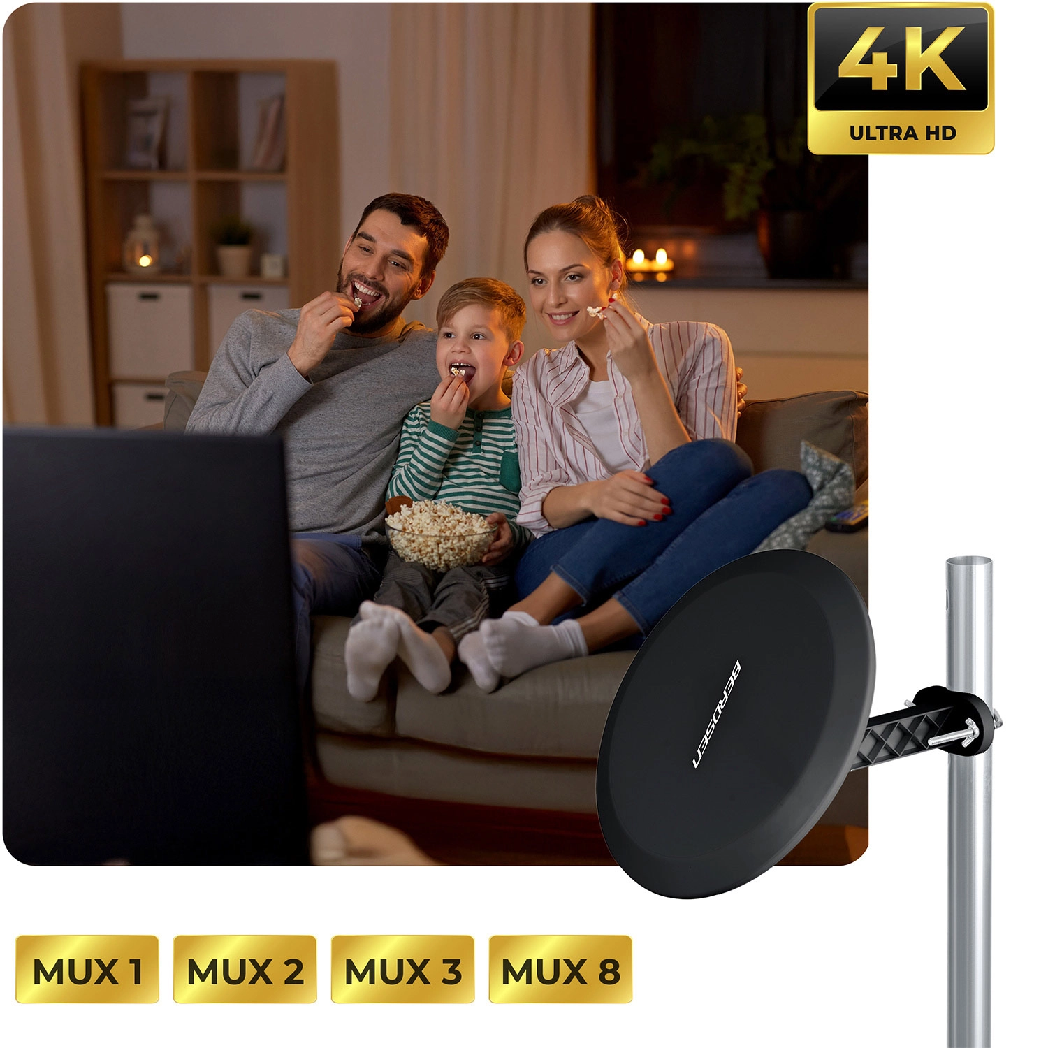 Het ingebouwde LTE-filter beschermt de ontvangst tegen storing van 4G/5G-netwerken, zodat je een schoon, scherp beeld behoudt, zelfs bij slechter weer. De antenne kan direct via de tv met USB worden gevoed, via een externe voeding met DC-aansluiting of via de tuner – de installatie kost slechts enkele minuten en vereist geen speciaal gereedschap.