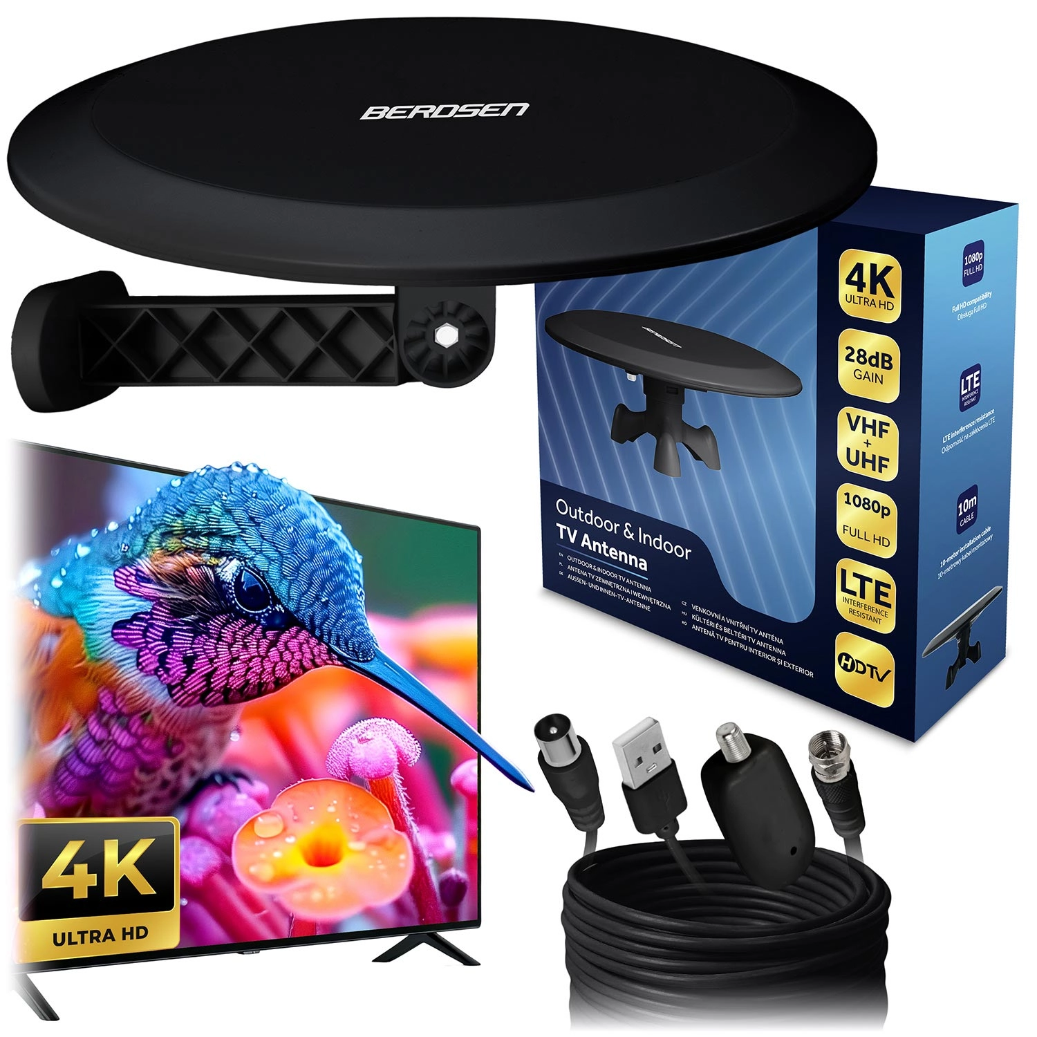 De actieve tv-antenne BERDSEN BD-955 is de ideale oplossing voor zowel stad als platteland. Hij biedt een hoog versterkingsrendement van 28 dB, ontvangst van de VHF- en UHF-banden inclusief alle multiplexen (MUX 1–8) en compatibiliteit met de standaarden DVB-T en DVB-T2. Dankzij de mogelijkheid tot montage binnen en buiten en de 10 m kabel vind je eenvoudig de optimale plek met het sterkste signaal.