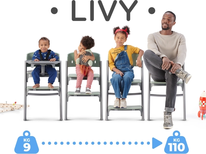 Eén stoel voor de hele kindertijd – een hoge kinderstoel, een stoel voor een ouder kind en een ergonomische stoel voor tieners of ouders (draagvermogen tot 110 kg).