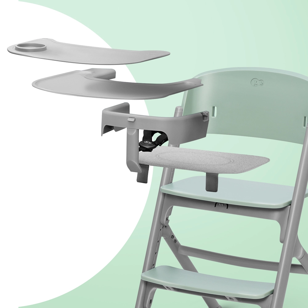 5-puntsgordel, stabiele staal-aluminium constructie en BPA-vrij siliconen blad dat in de vaatwasser kan, voor hygiënisch en comfortabel gebruik.