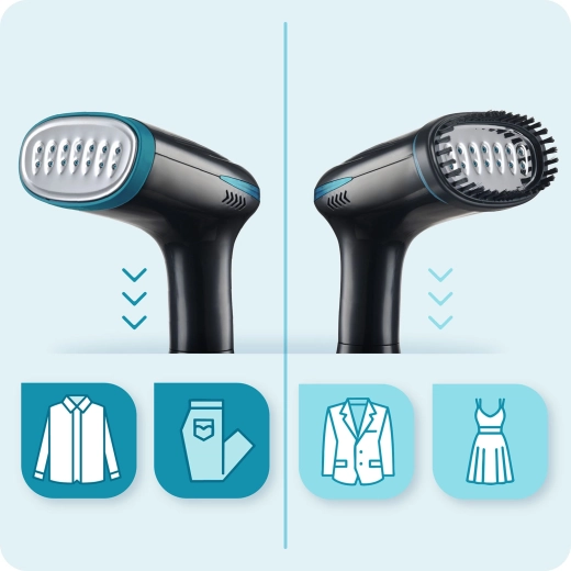 - Brede toepasbaarheid: zonder opzetstuk voor gladde en stevige stoffen (overhemden, broeken, katoen), met borstelopzetstuk voor delicate materialen (breisels, zijde, dunne jurken).