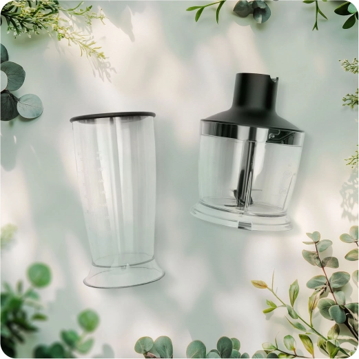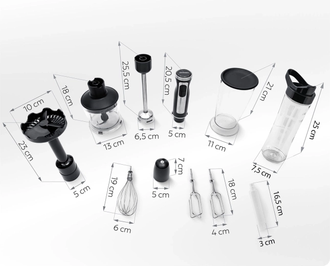 De rijke accessoires dekken tot 7 keukenfuncties: staafmixen, hakken, kloppen, kneden/mengen, het bereiden van puree en smoothies in de draagbare 600 ml fles (BPA-vrij) met handige drinktuit en koelmodule. Veiligheidsfeatures zoals een vergrendeling tegen onjuiste montage en oververhittingsbeveiliging zorgen voor gemoedsrust tijdens het gebruik.
